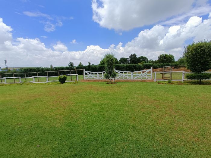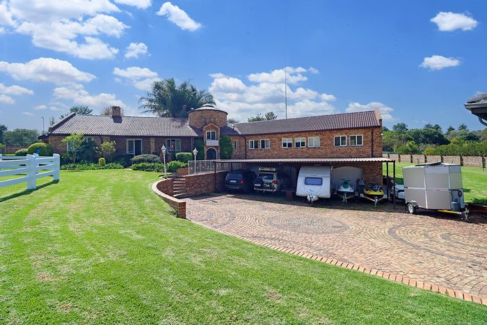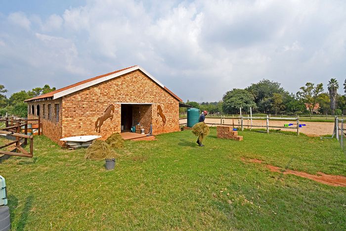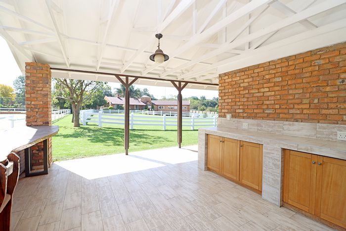 Horse-friendly country living in secure Randjesfontein Equestrian Estate, moments from shopping and schools. Thatched home with private stables, heated pool, five bedrooms, three bathrooms and five garages.