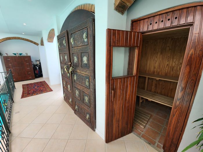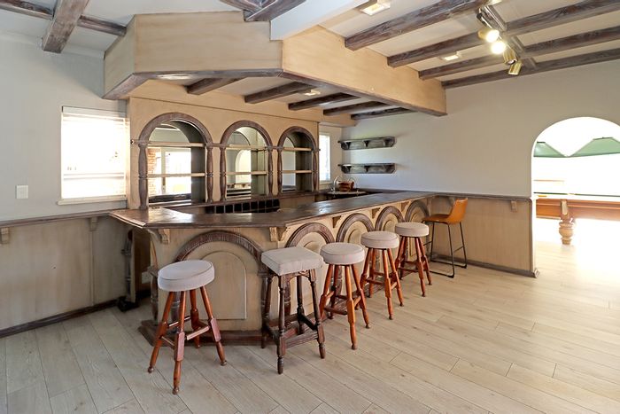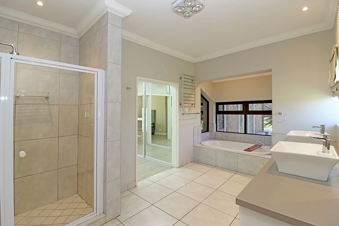 Entertainer’s equestrian estate in Randjesfontein Country Estate, with skylight-lit indoor pool, renovated tennis court, arena-ready paddocks and 27km private trails — eight beds, six baths, five garages.
