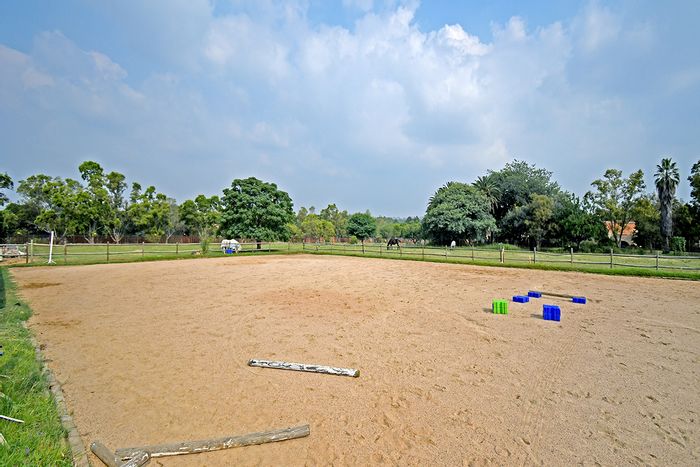 Live an equestrian lifestyle on 1.5 hectares in Randjesfontein Country Estate, with five stables and sand arena, heated pool, floodlit tennis court, and a 4-bedroom main house plus cottage.