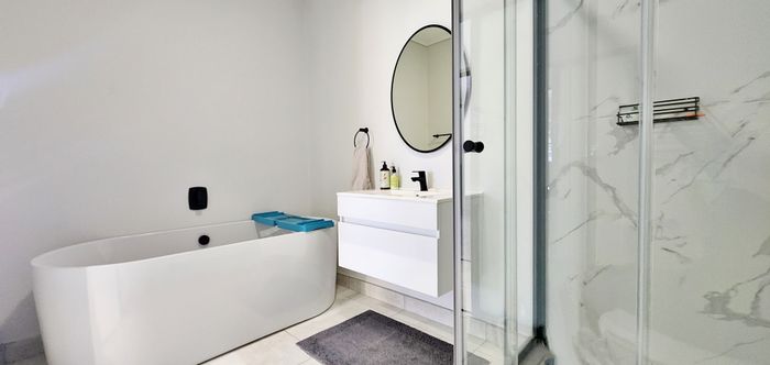Turnkey executive living in Polofields, Waterfall — minutes to Mall of Africa and highways; first-floor 3-bedroom, 2-bath apartment with inverter backup, no load shedding, and double covered parking.