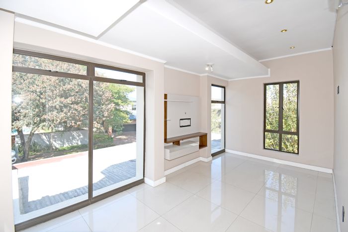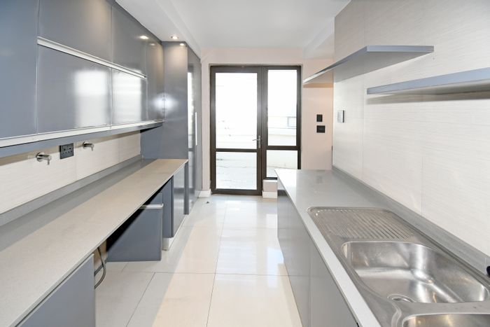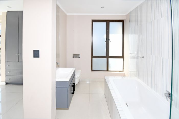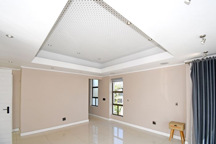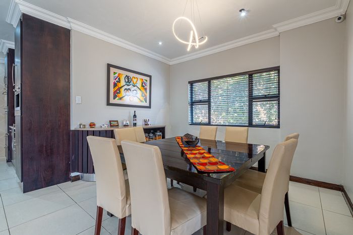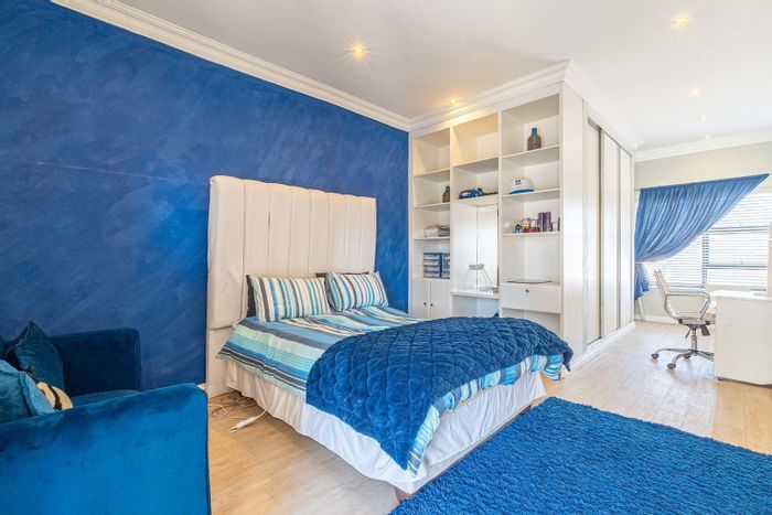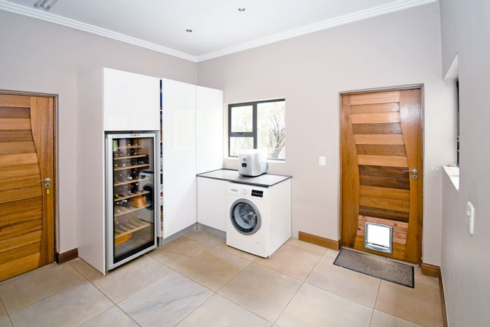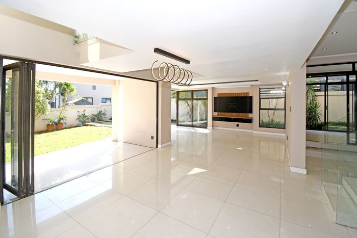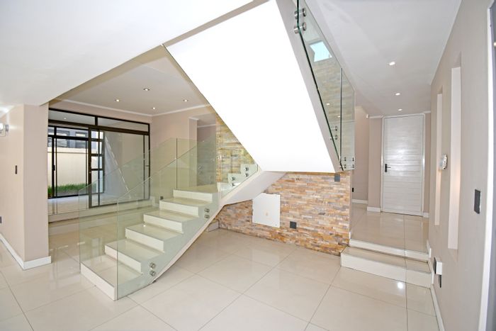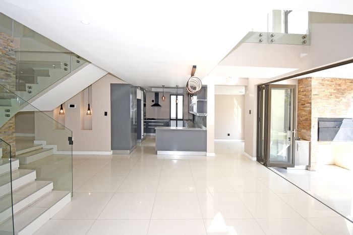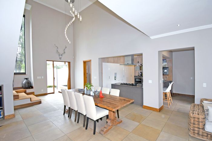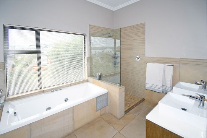 Light-filled modern family home in Waterfall Country Village, moments from the clubhouse. Designer kitchen with built-in coffee machine, stacking doors to covered braai patio and garden. 4 beds, 3.5 baths.