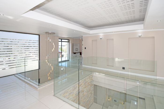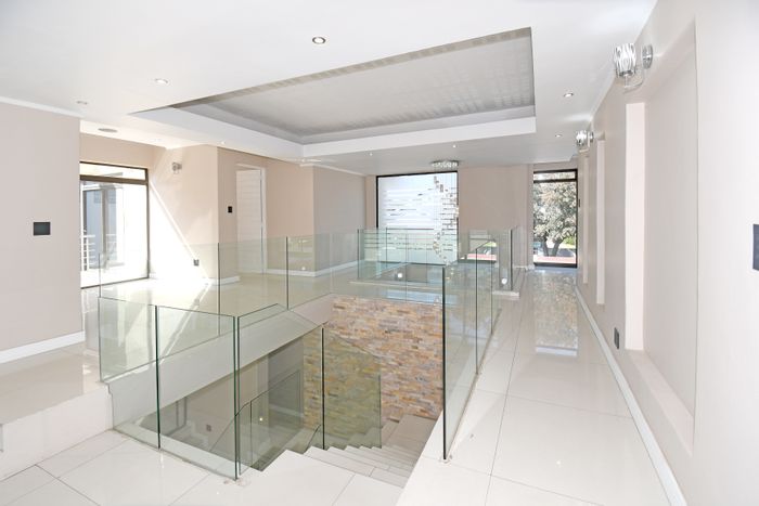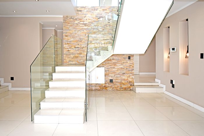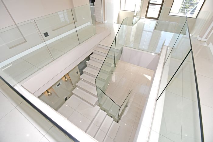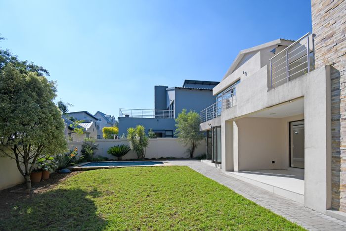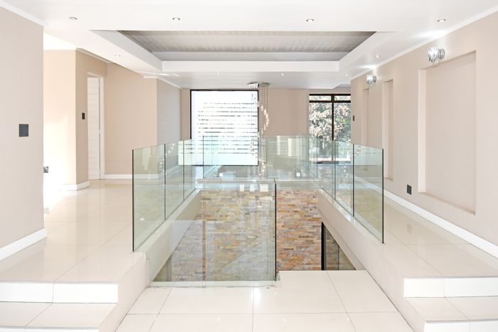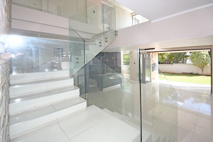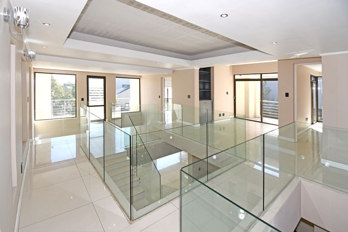 Resort-style entertaining in Waterfall Village, ten minutes from Sandton CBD, with glass-and-stone living, covered patio, feature pool and gas barbecue; four en-suite bedrooms, 4.5 baths, four garages.