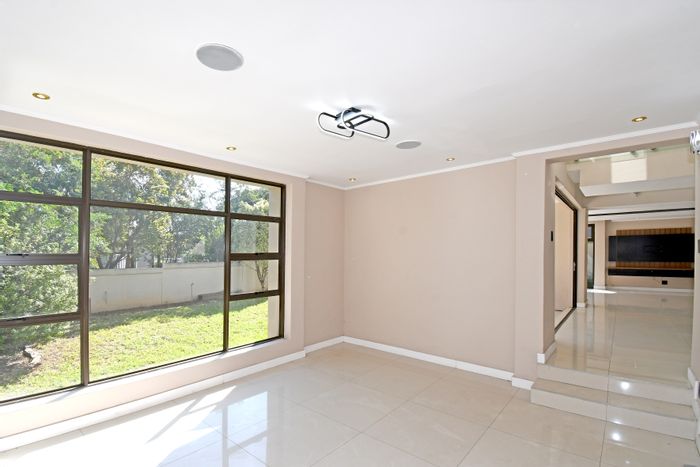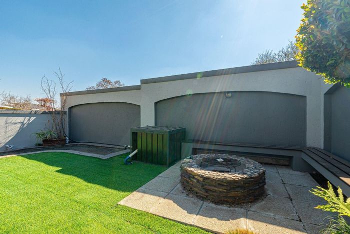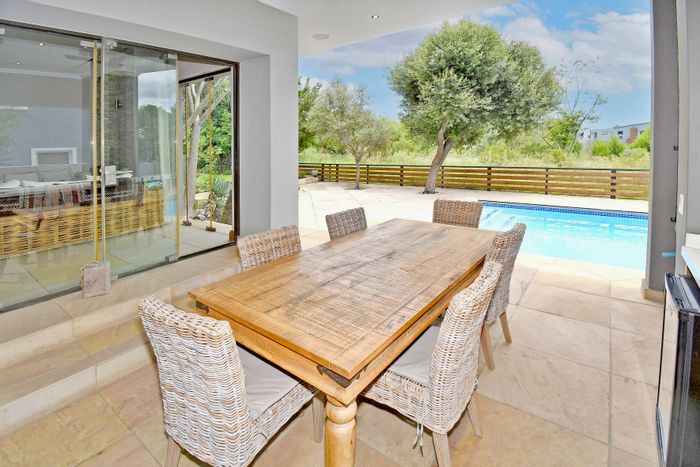 Secure Waterfall Village estate living with country charm and top-class amenities. Open-plan kitchen flows to covered patio with built-in braai, pool and lush garden; striking glass pivot door.