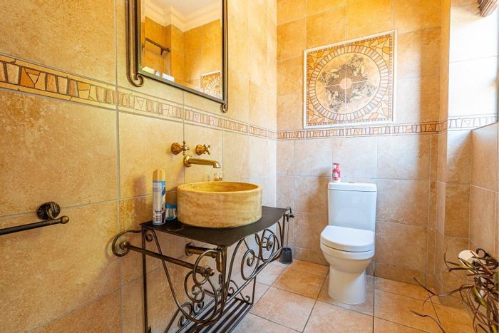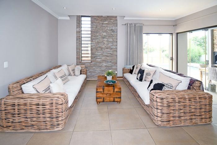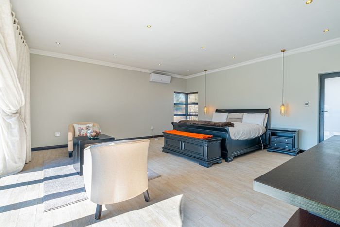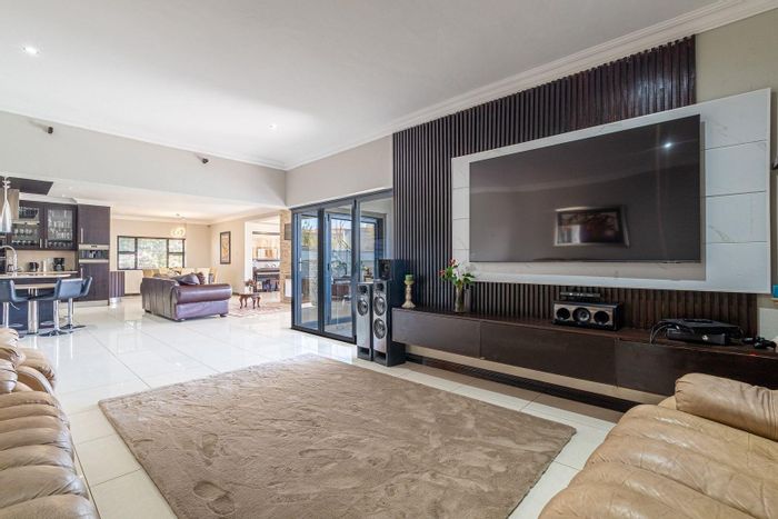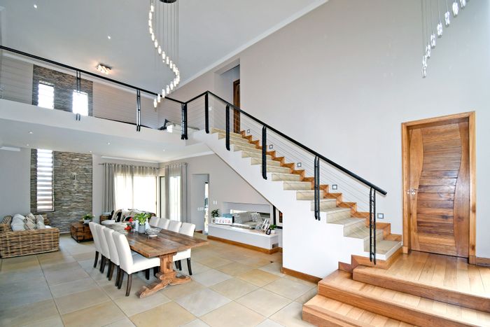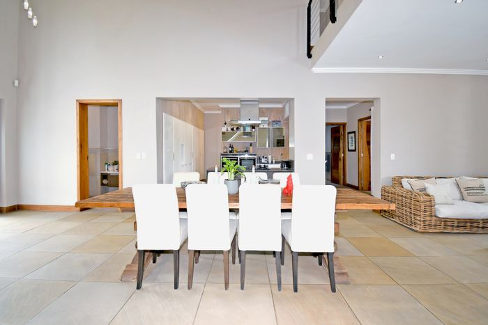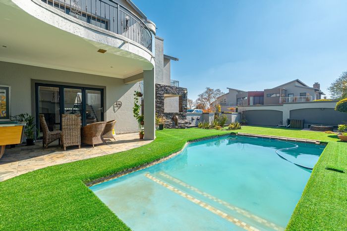 Dam-front entertainer in Waterfall Country Village Estate, steps from the clubhouse, with pool, covered braai patio, cinema room and premium kitchen. Five bedrooms, double garage.