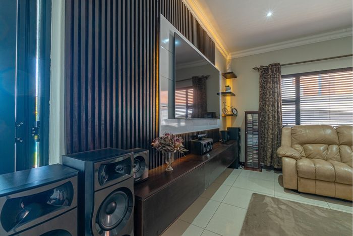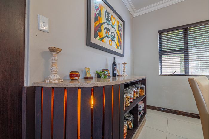 Peaceful street steps from the lifestyle centre — ambient-lit wooden deck and glass door lead to open-plan living with scullery, braai patio and cycad garden. 4 beds, 3 baths, 2-car garage.