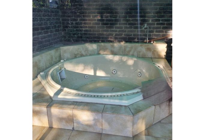 Resort-style family living in Sharon Park, Gauteng, on a quiet street — lush garden, sparkling pool and jacuzzi, renovated eat-in kitchen; includes four bedrooms and six-car garage.