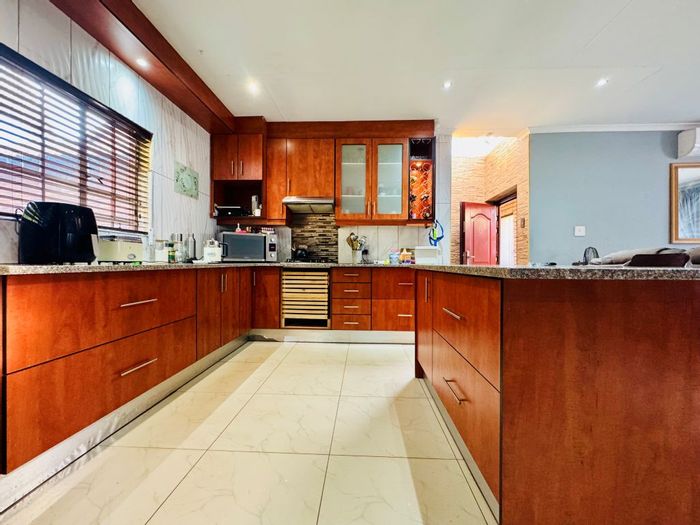 Entertain effortlessly in a manicured garden, with lapa bar and braai plus pool; wooden island kitchen, private study — three beds, two baths, double garage.