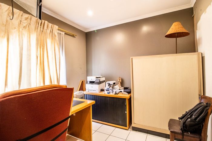 Peaceful suburban retreat in sought-after Pretoriuspark, Garsfontein, set on a generous stand with thatched charm — features a lapa with built-in braai, balcony, four bedrooms, three baths.