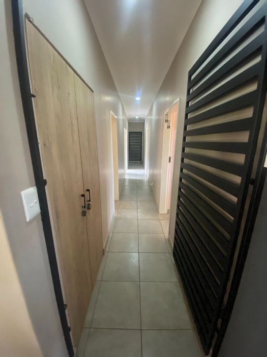 Magalieskruin living near Sefako Makgatho Drive, malls and schools. Open-plan kitchen flows to patio with built-in braai and private garden. Three beds, two baths, garage and two parking spaces.