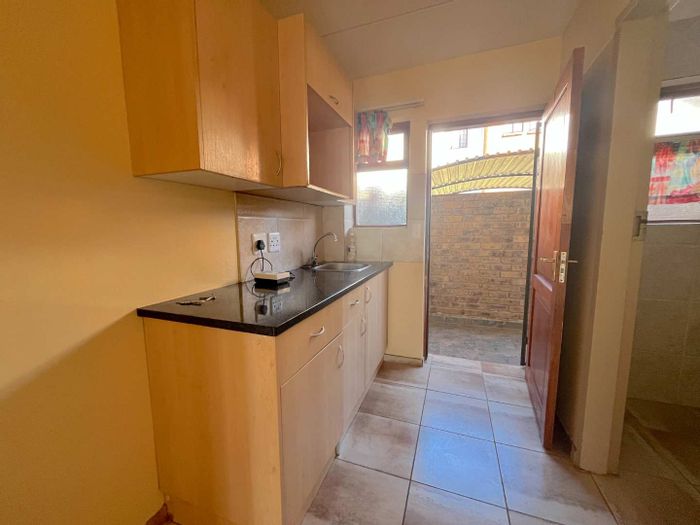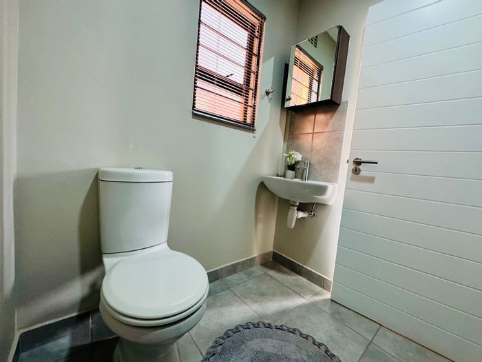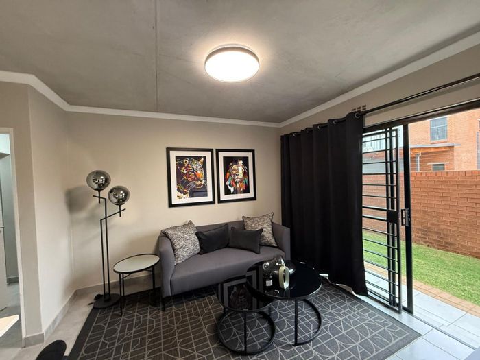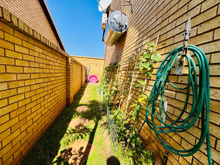 Tranquil Doornpoort two-bedroom townhouse offering open-plan living, elegant kitchen and outdoor built-in braai leading to a private garden. Solar geyser, single garage and access-controlled suburb near schools and shops.