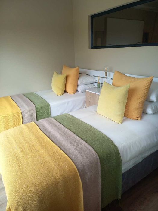 Relaxed family living near schools, shops and hospital in Montana, featuring a large corner garden, patio with built-in braai, private balcony, two bedrooms and two en-suite bathrooms.