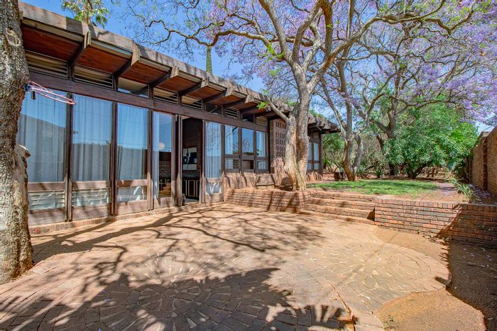 Live among jacaranda-lined avenues in central Muckleneuk — expansive 2,553m² stand with mature garden, pool and central open-air atrium; three bedrooms, two bathrooms, double garage.
