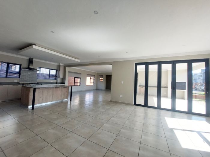 Family-focused living in a secure estate with lakes, parks and trails; open-plan kitchen with island and covered patio with built-in braai. Four bedrooms, three bathrooms, double garage.