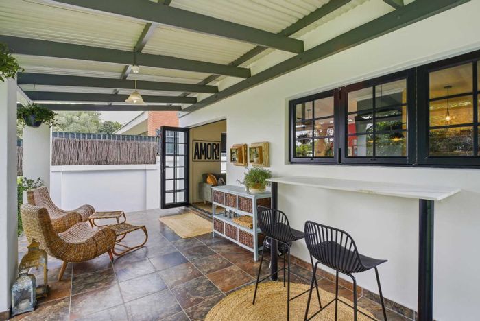 Entertain effortlessly in Waterkloof — patio for braais opening to garden and pool, minutes from schools, airport and Brooklyn Mall; three bedrooms, two baths, covered parking.