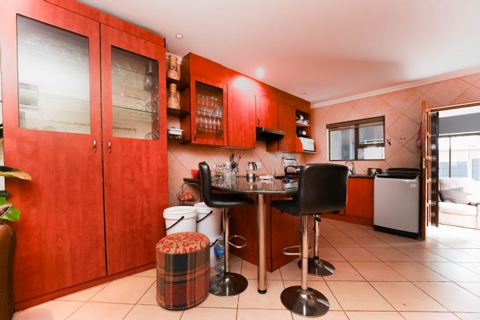 Entertainer's lifestyle in Greenhills, close to Randfontein schools — duplex with private garden terrace and retro pass-through kitchen; three bedrooms, double garage, sunny office.