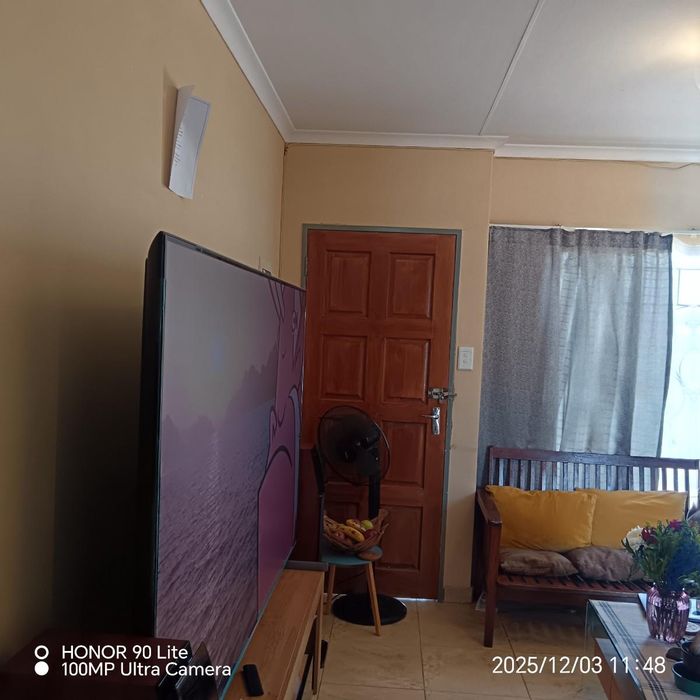 Low-maintenance, secure two-bedroom home in a quiet, convenient neighbourhood near shops and transit. Tiled open-plan lounge, remote-controlled gate and ample paved parking for five vehicles.