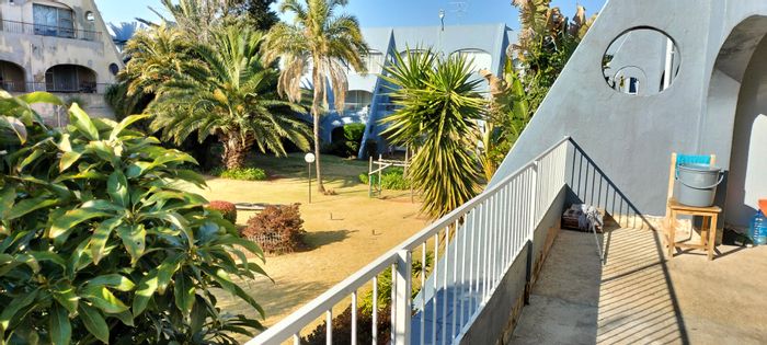 Relaxed garden-side living with a first-floor balcony overlooking green communal gardens and pool — two bedrooms, one bathroom, covered parking, and security gate.