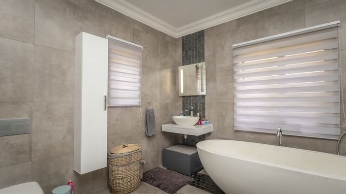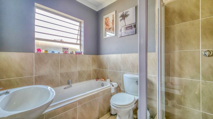 Family-focused estate living in Baltimore Lifestyle Estate near Jackal Creek and Lanseria, with a covered patio and built-in braai opening to a pet-friendly irrigated garden. Three bedrooms, 2.5 baths.