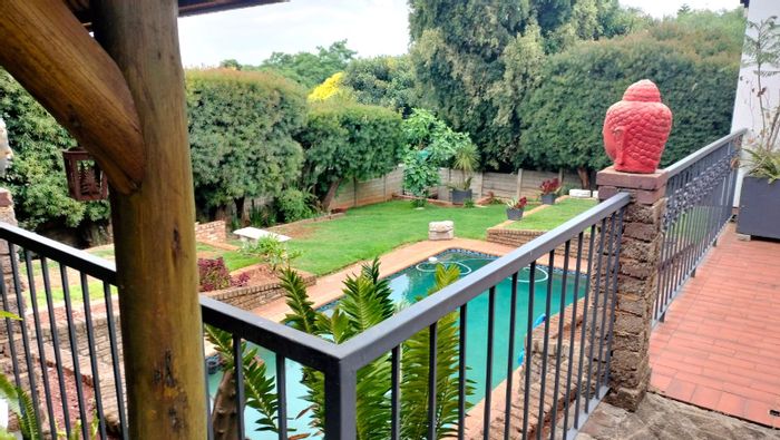 Entertainer's lifestyle in Helderkruin gated enclave with sweeping Magaliesberg views and seamless indoor-outdoor flow, featuring a koi pond, four bedrooms, three bathrooms, single garage.