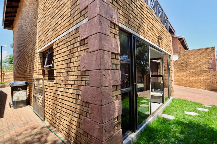 Relaxed suburban lifestyle in Honeydew, Roodepoort with secure, gated complex and communal garden with sprinklers. Converted loft creates versatile third bedroom; open-plan kitchen and balcony views.