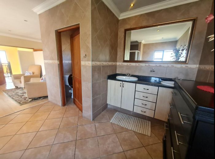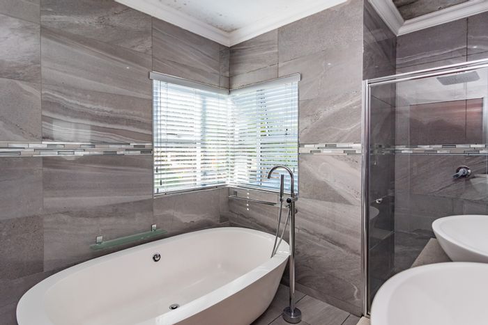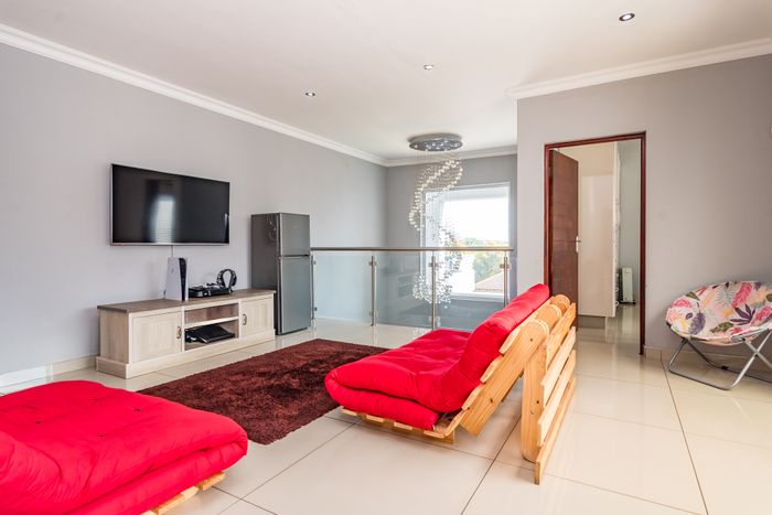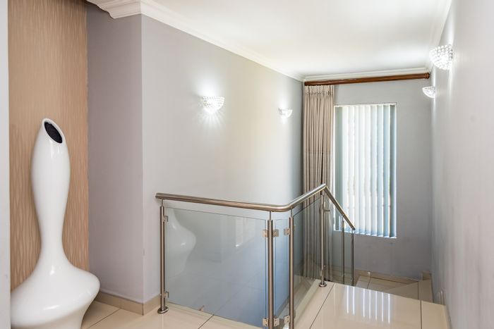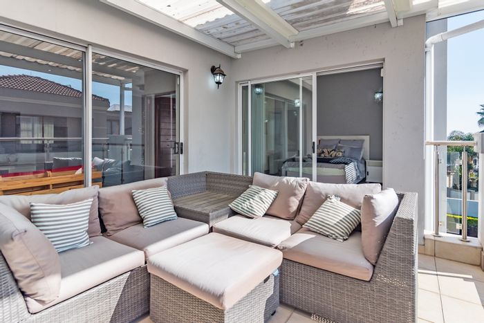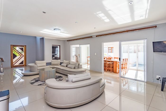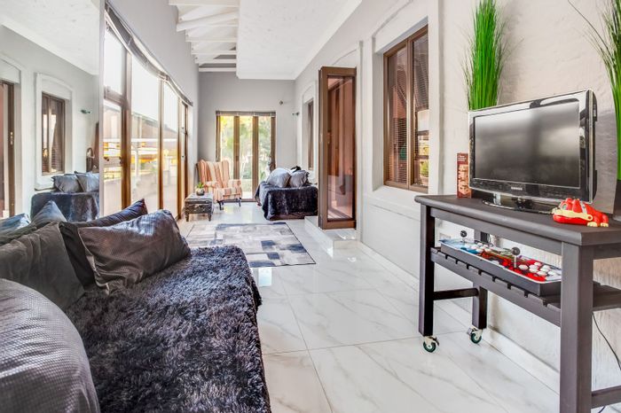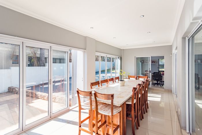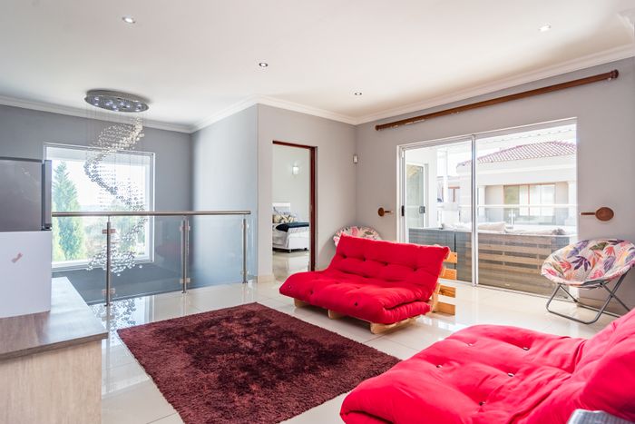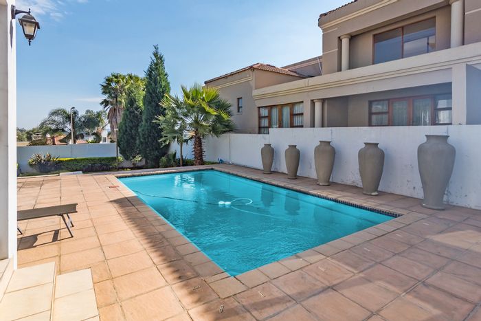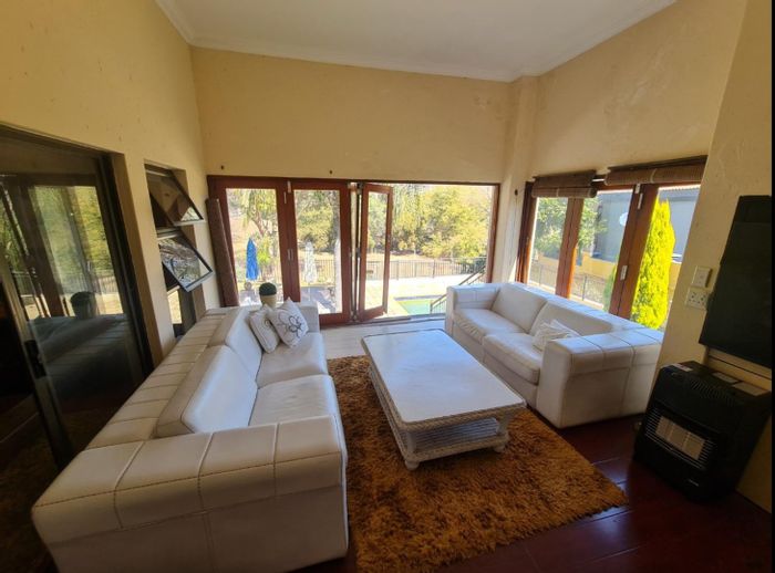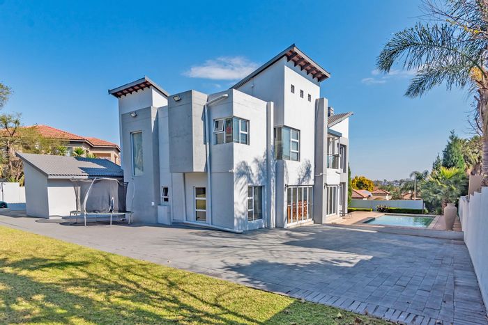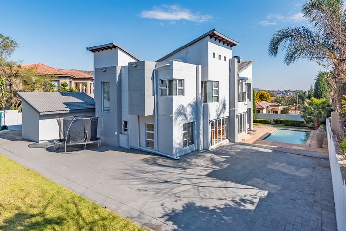 Entertain with valley and Featherbrooke views in sought-after Ruimsig Country Estate — braai room with stack doors to pool and deck, private main-floor suite with balcony and pyjama lounge.