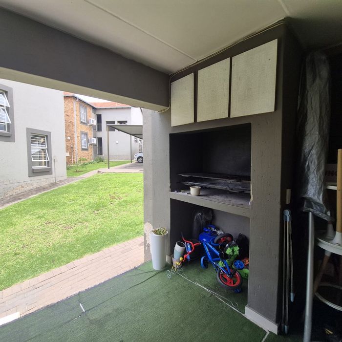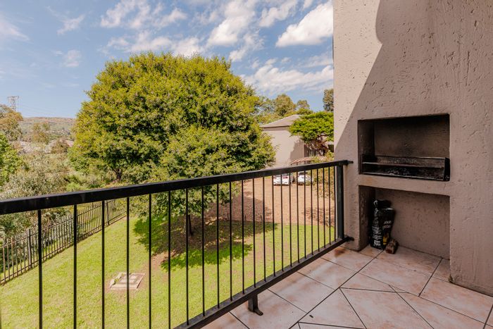Relaxed urban living in Wilgeheuwel with quick access to shopping and main routes; open-plan kitchen with granite countertops and balcony with built-in braai. Two bedrooms, one bath, covered carport.