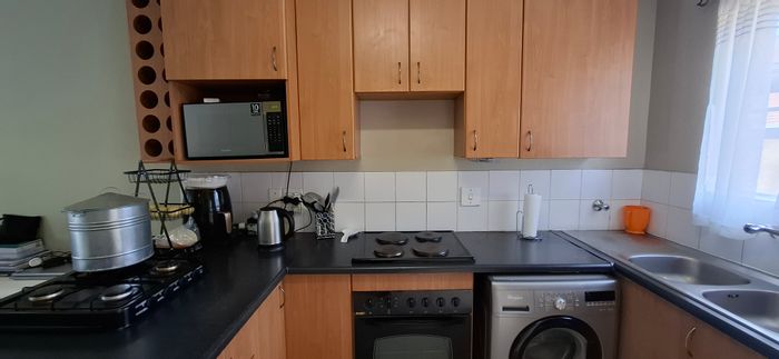 Relaxed suburban living with easy access to shops, parks and schools in Wilgeheuwel, Roodepoort; private garden, modern kitchen and two bedrooms, one bath with double covered parking.