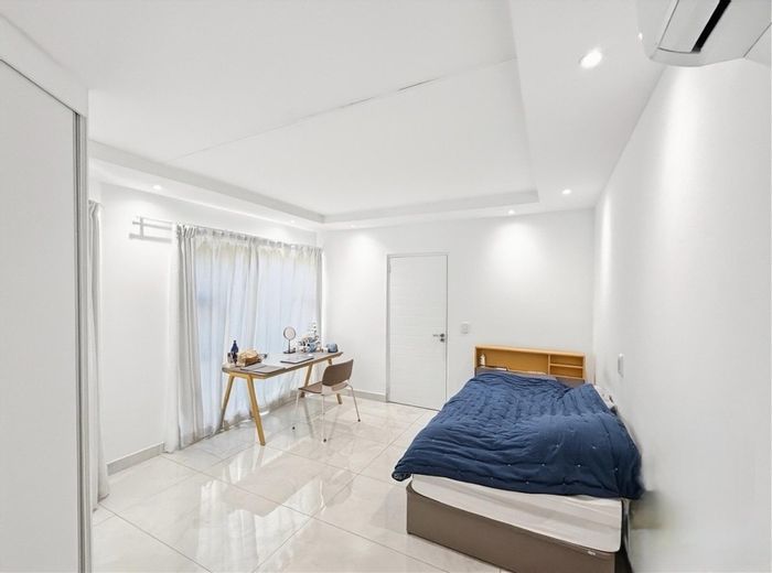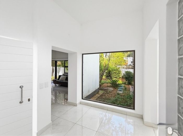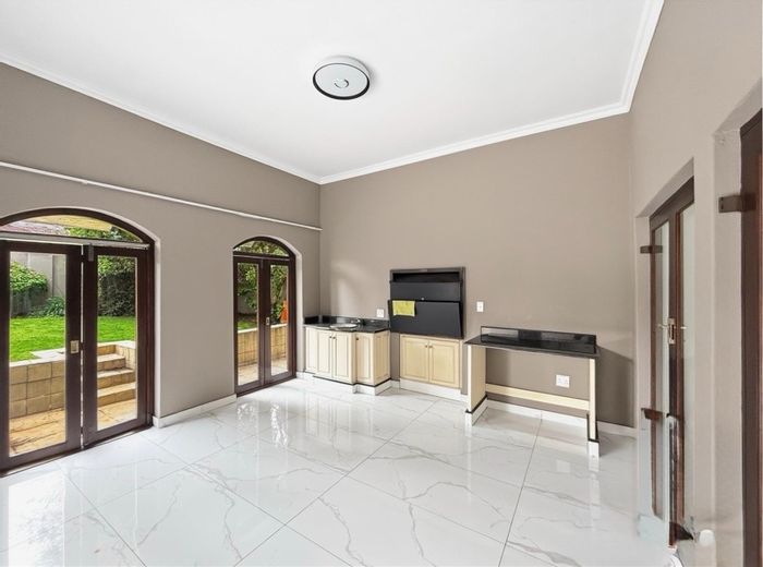 Clubhouse-adjacent modern apartment with seamless indoor-outdoor flow to a covered patio and private garden, walking distance to Dainfern Square and Fourways amenities; three beds, two baths, two covered parking spaces.