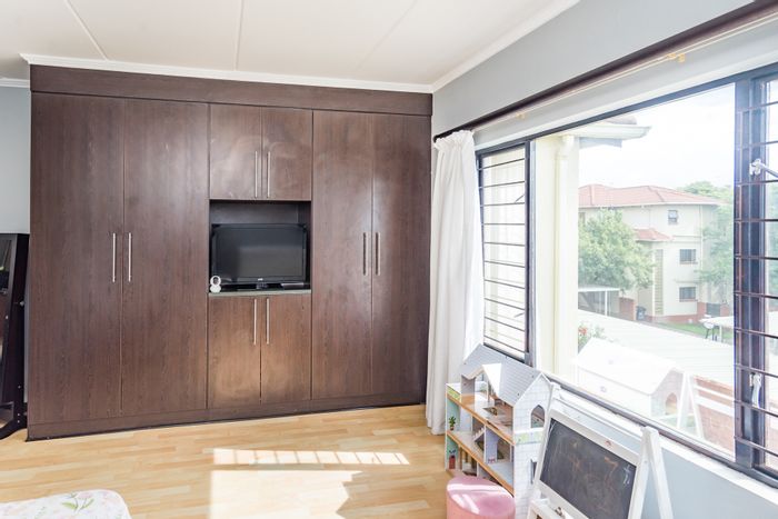 Effortless lock-up-and-go living in Douglasdale, close to shops and schools, with double-volume living flowing to a covered patio and built-in braai — three beds, three baths, two covered parking bays.