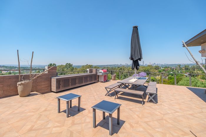 Enjoy elevated Sandton living with panoramic city views, an expansive patio for entertaining and a modern kitchen; includes four bedrooms, three bathrooms and three covered parking.