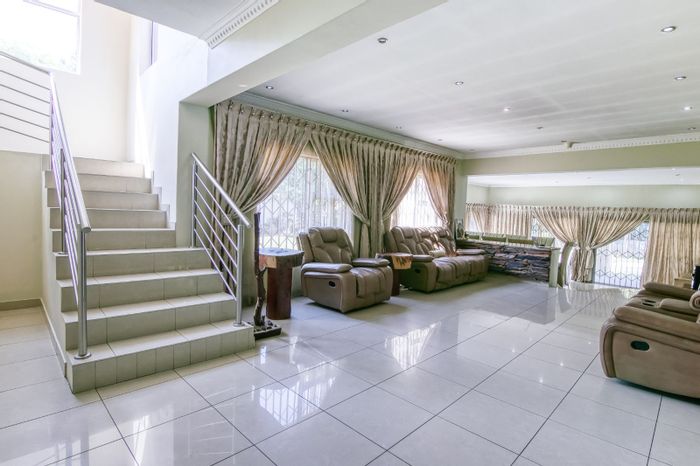 Entertain in Sandton's Kelvin neighbourhood with a gallery-style entrance, expansive balcony and poolside lapa — tranquil master retreat. Five bedrooms, five bathrooms and double garage near Gautrain and shops.