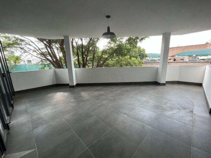 Enjoy cafes and effortless commutes from Rivonia, across Rivonia Boulevard — first-floor apartment with a balcony overlooking the Sandton skyline, one bed, one bath.
