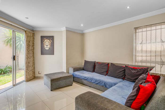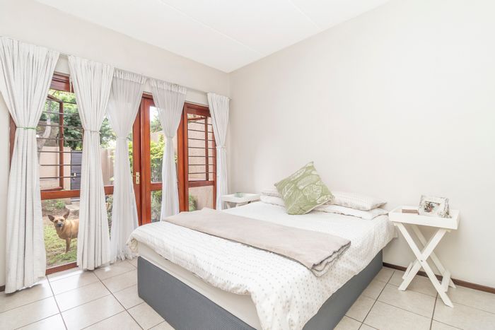 Entertain in Sunninghill’s Ellingham Estate — vibrant, secure community near Sandton and Chilli Lane. Renovated kitchen, enclosed patio and wrap-around irrigated garden. Three beds, two baths, garage.