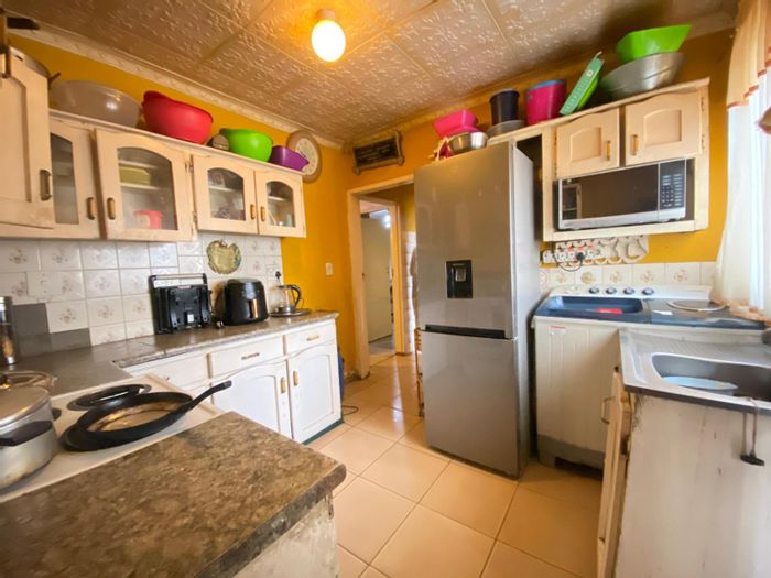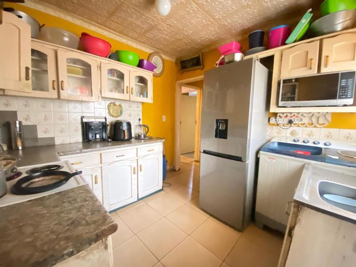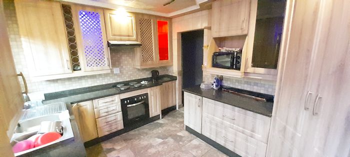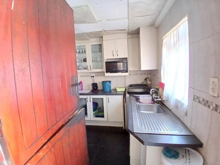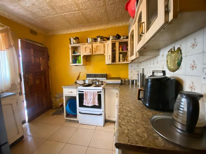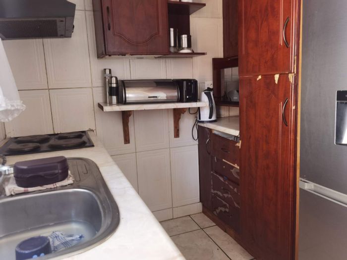 Family-friendly living in Gatlamping, Tembisa, with a spacious melamine kitchen and five outside rooms. Seven bedrooms, one bathroom, single garage; fully paved, walled, near transport and schools.
