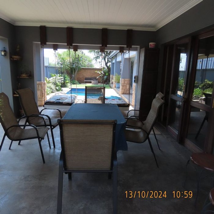 Entertainer's paradise in Vanderbijlpark, Gauteng, with expansive yard views from a generous balcony and entertainment area. Features two kitchens, six bedrooms, three bathrooms and one-car garage.