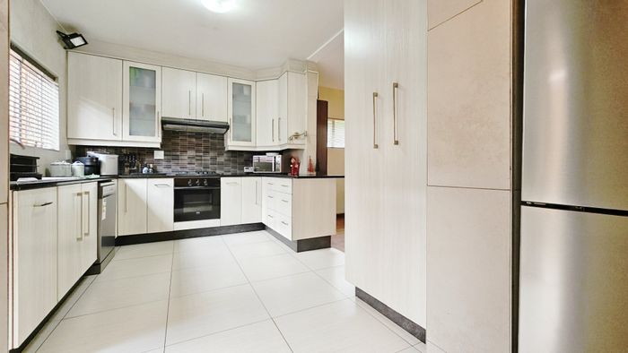 Entertainer's garden with built‑in braai and double electronic garage in a well‑located suburban setting; immaculate, spacious rooms with en‑suite plus guest toilet — three bedrooms, two bathrooms.