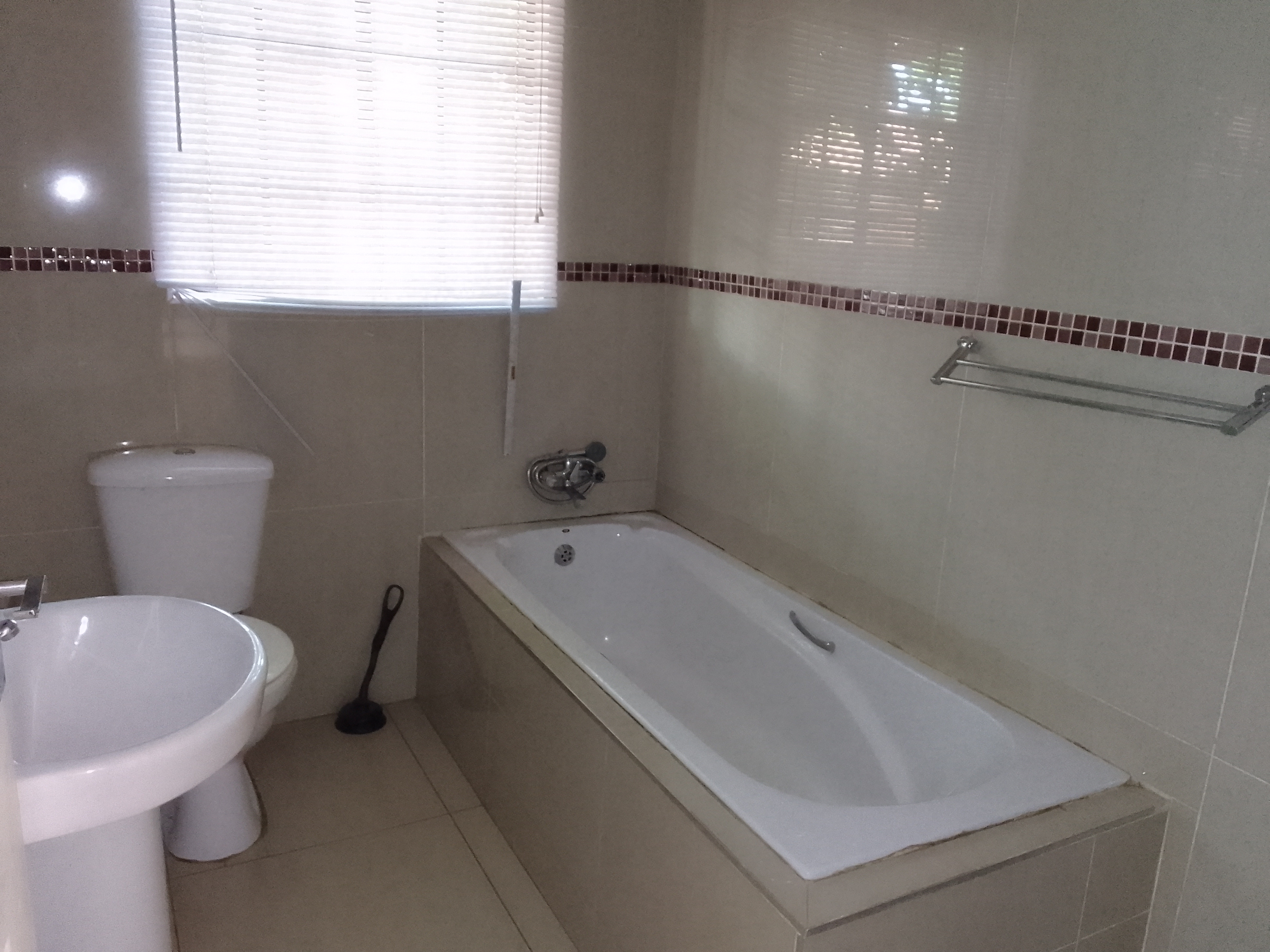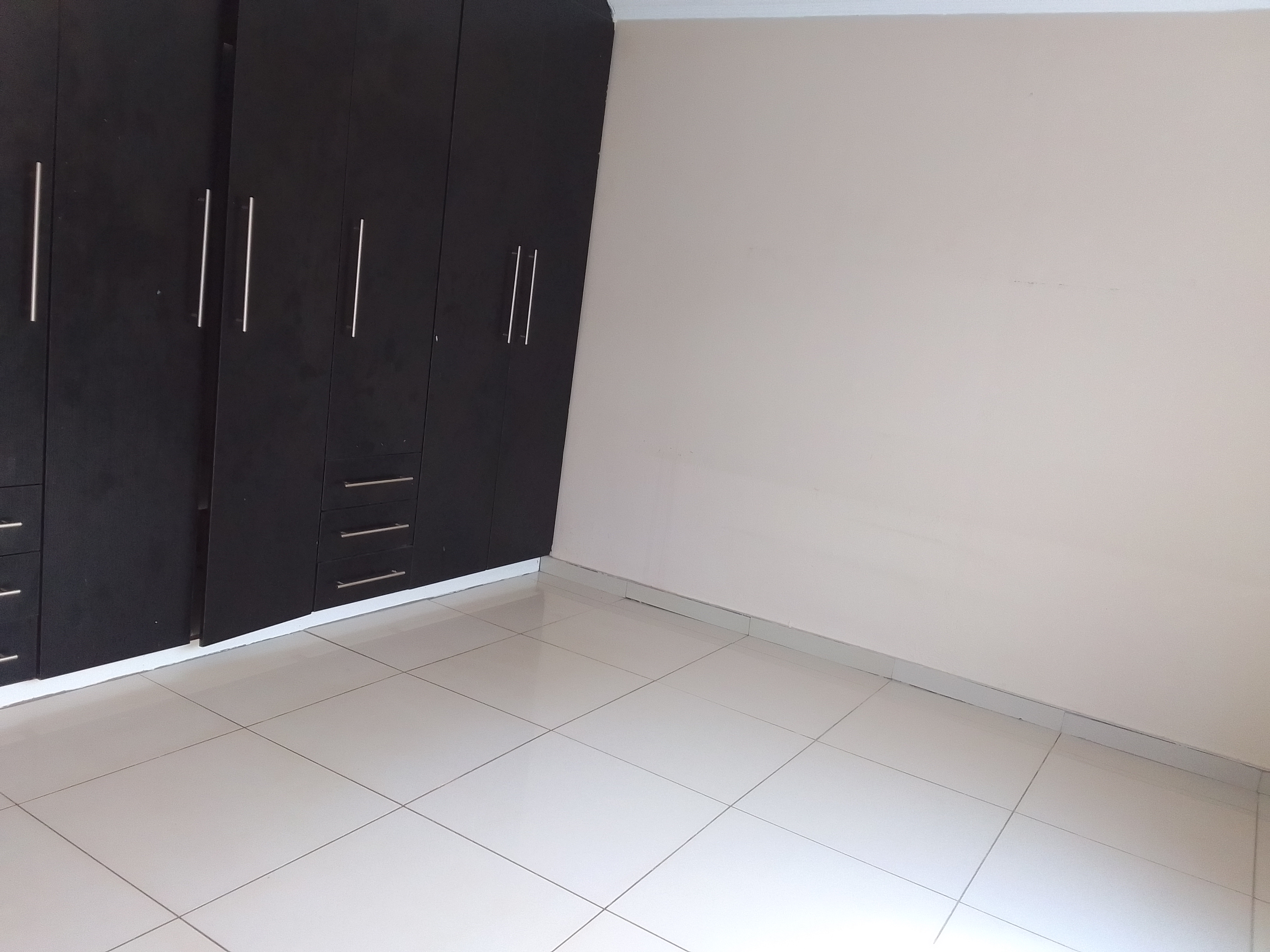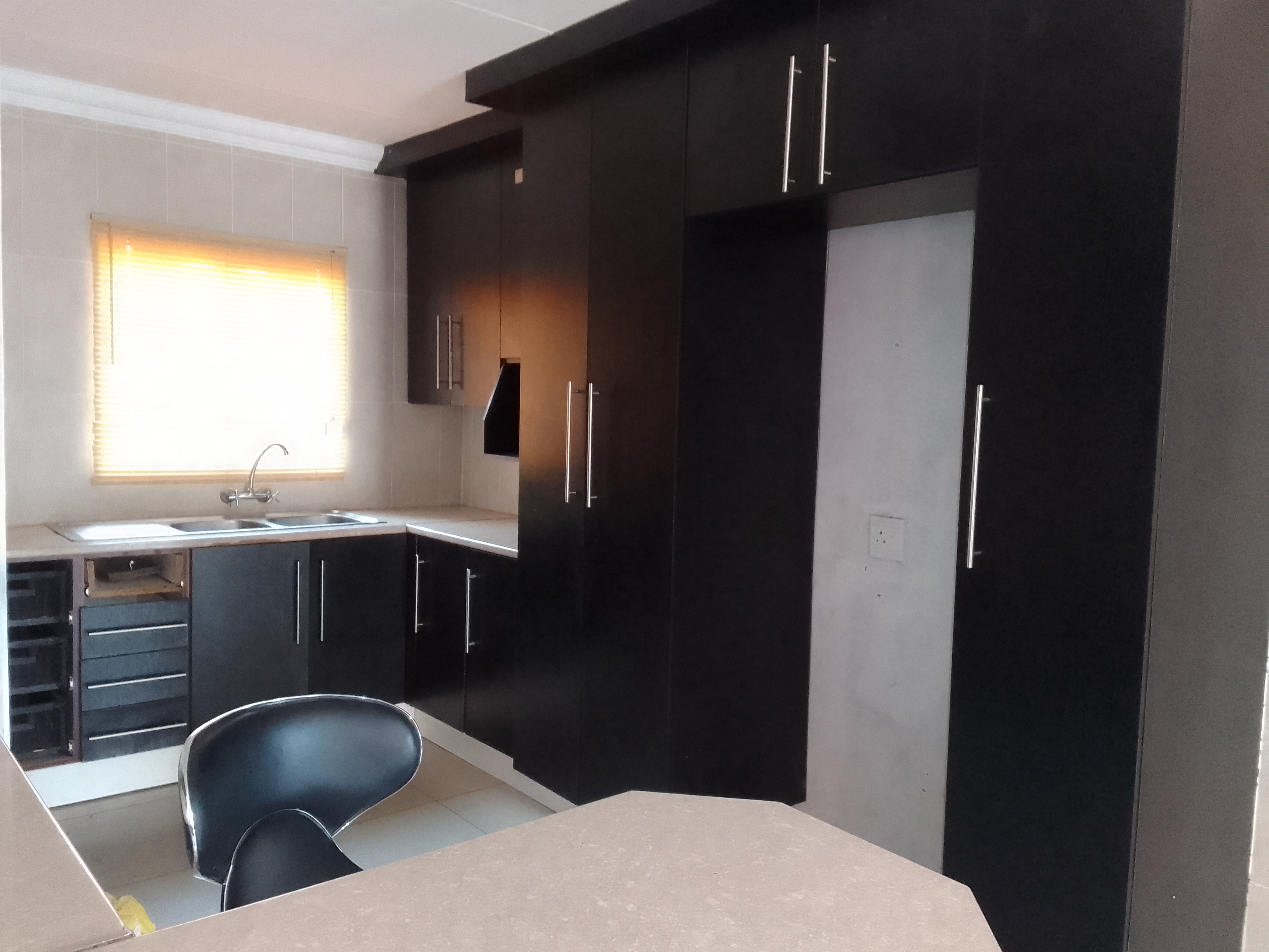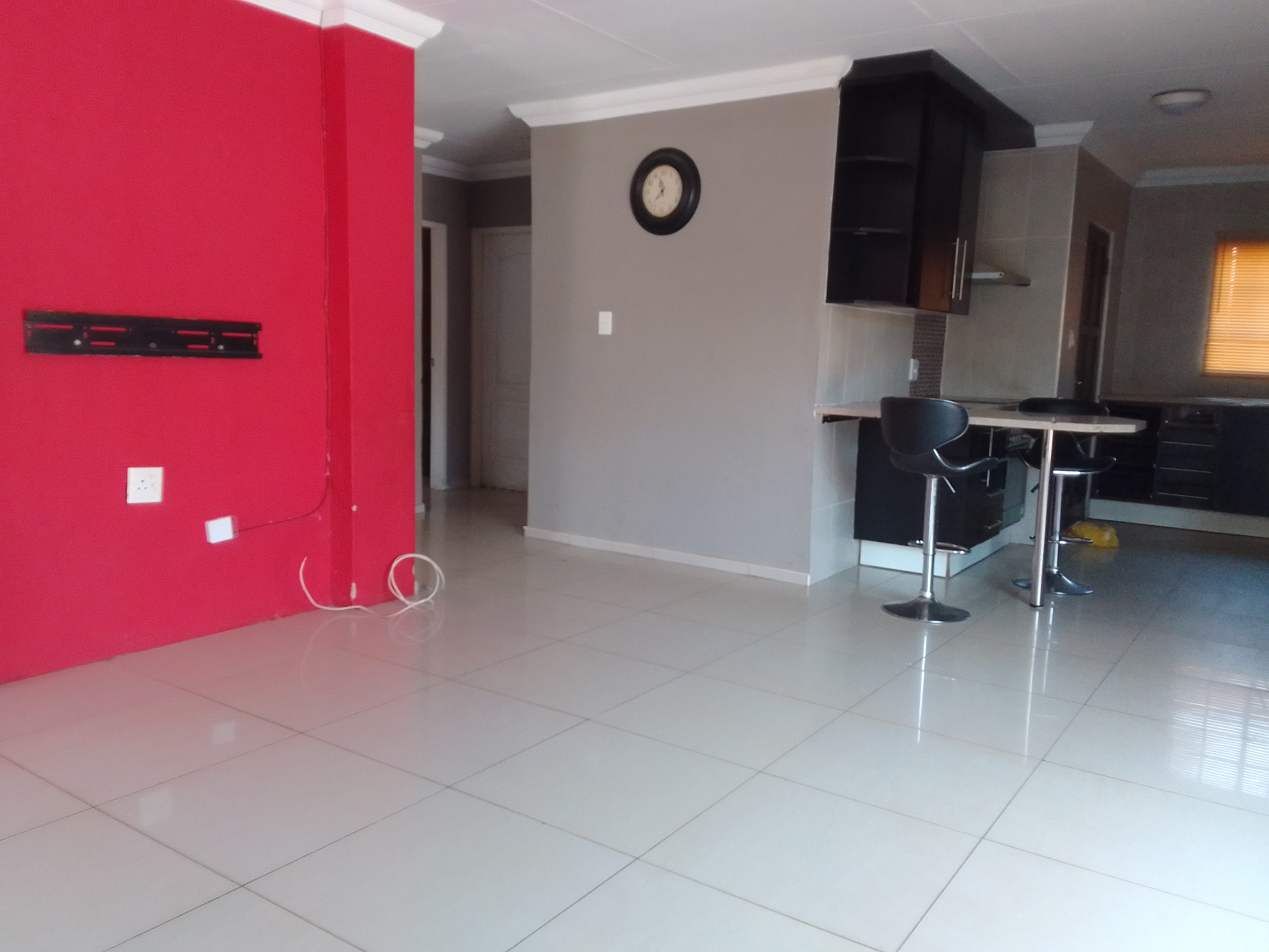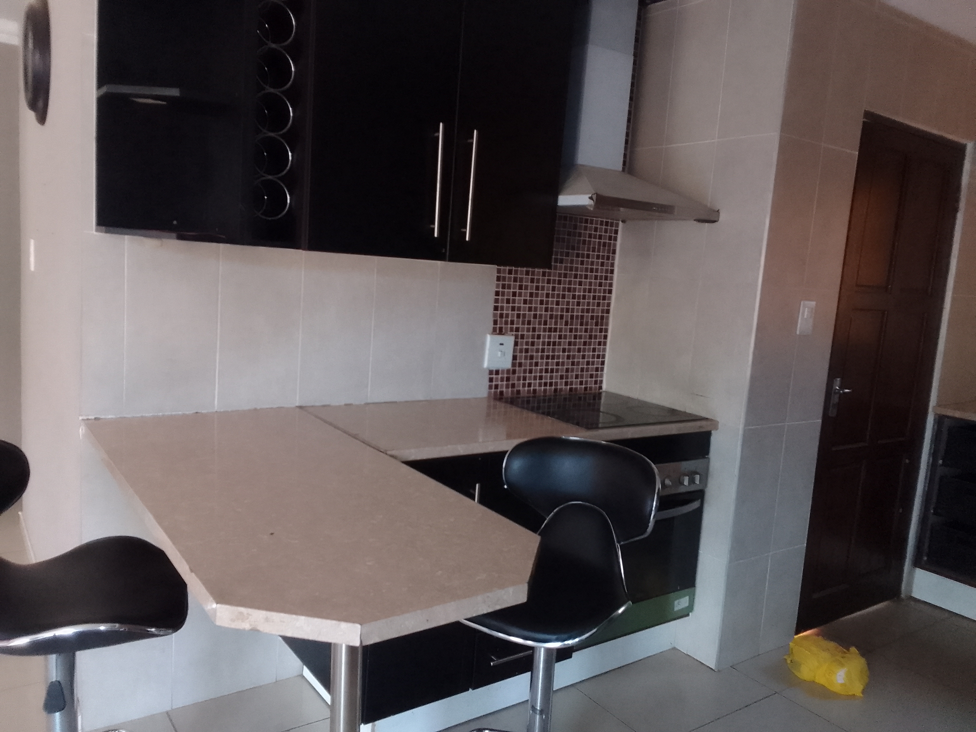 The sleek open-flow kitchen and lounge area make family time a joy, enhanced by gleaming tiles and a fresh, modern color scheme. Rich dark wood cupboards add warmth and sophistication to the home’s contemporary design.