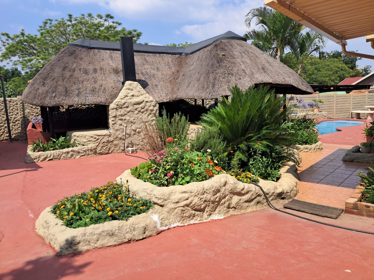 Outdoor living is made easy with a lapa and braai area, perfect for entertaining, overlooking a sparkling swimming pool. The property also includes a carport for up to four cars.