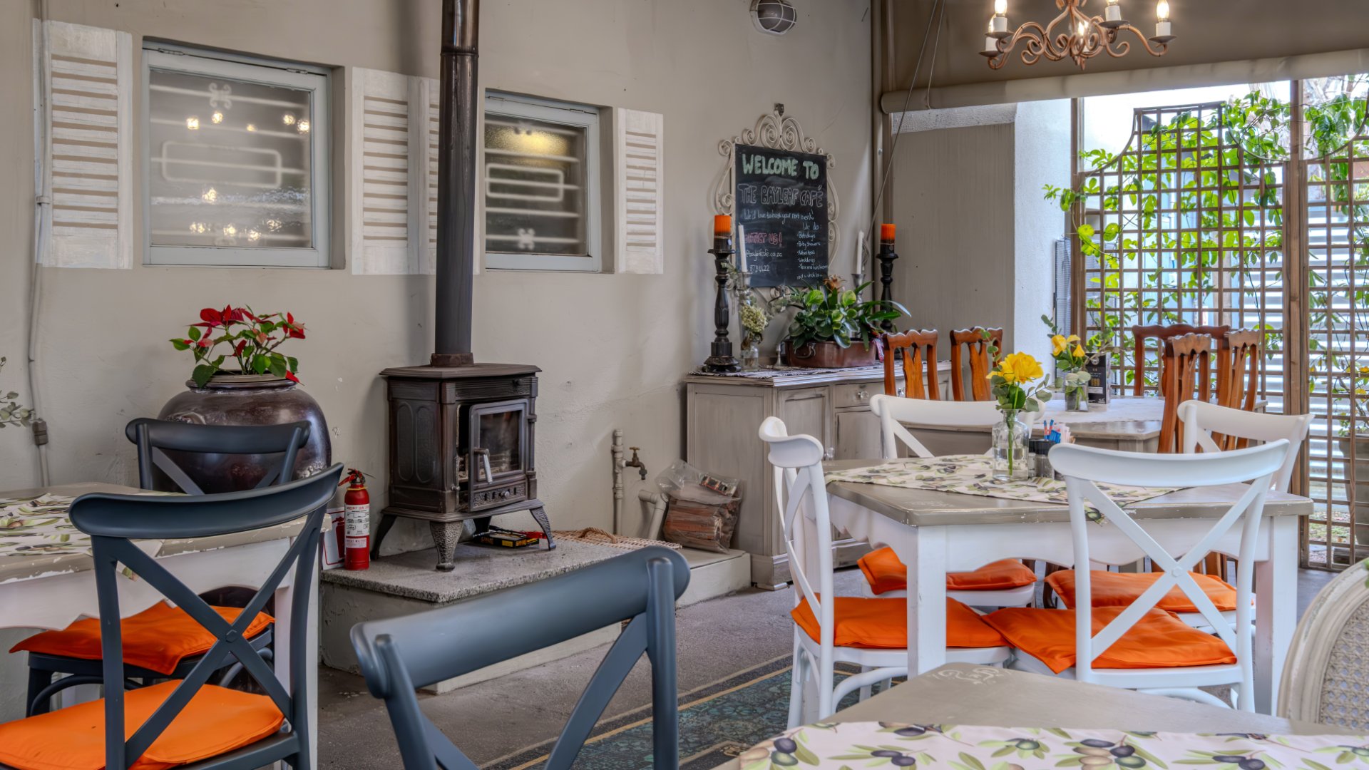 The interior offers a warm, welcoming setting with a tasteful blend of rustic charm and contemporary touches. Large windows invite in natural light, while the open layout creates a relaxed dining experience. Guests can choose between cozy indoor seating or dine alfresco in the lovely outdoor area—perfect for sunny days giving it a very European feel.