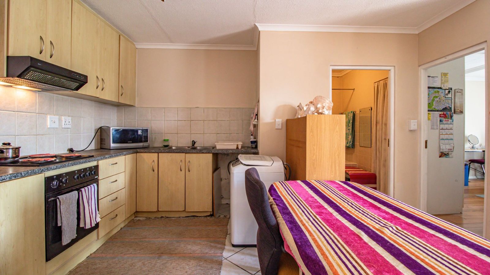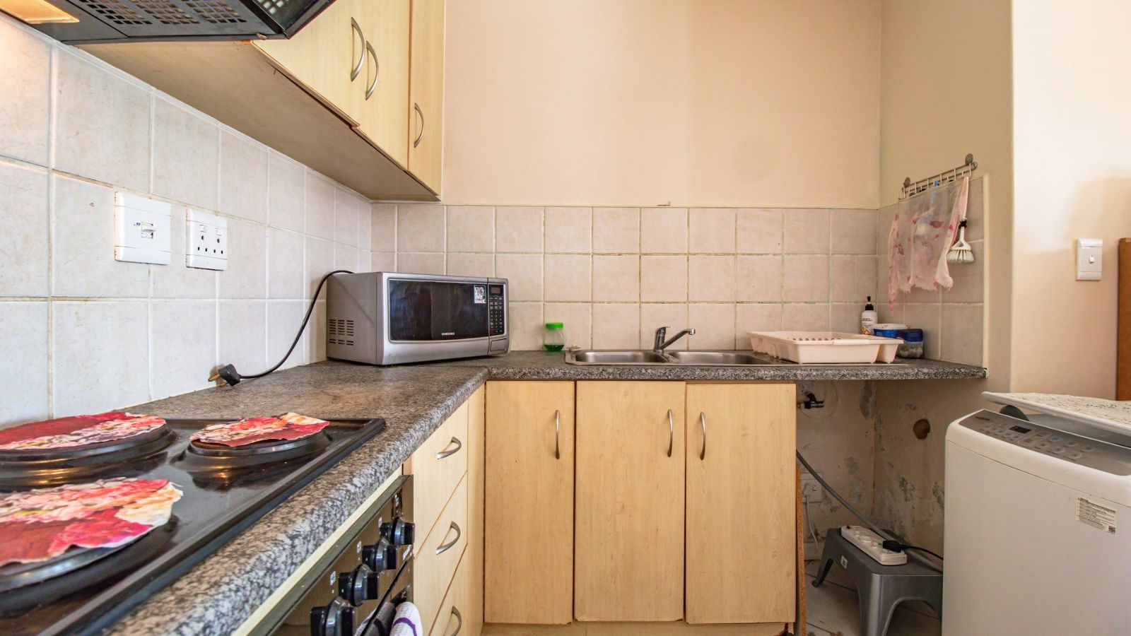The apartment offers an open-plan kitchen with ample space for a fridge, freezer and a water point for a washing machine.