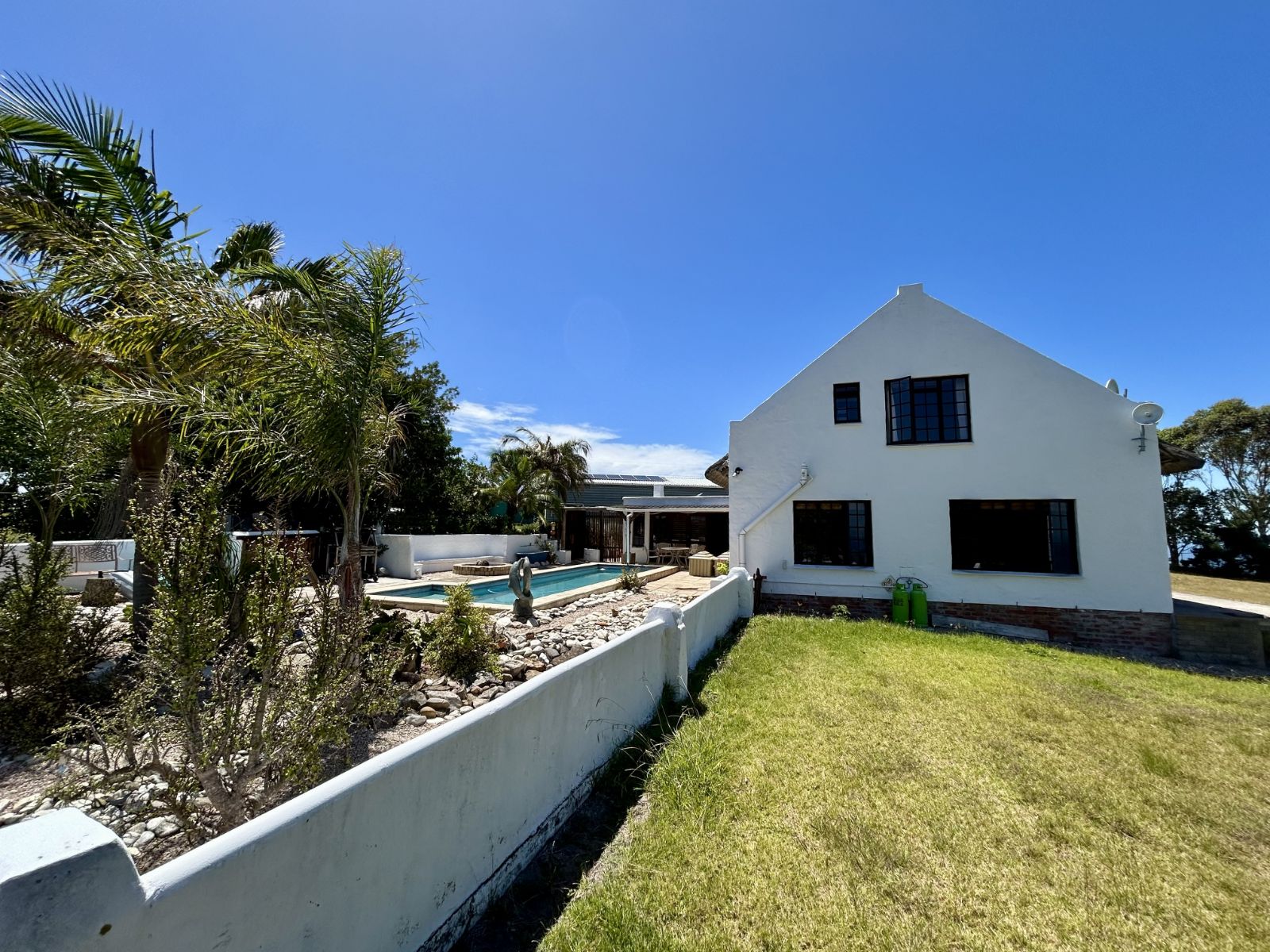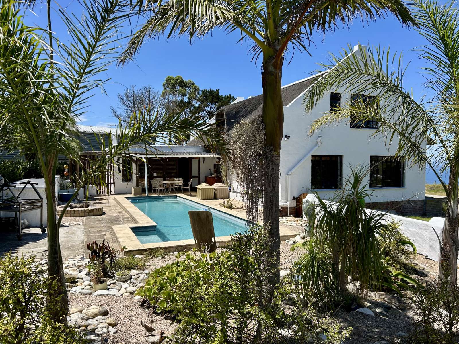 Main House: A spacious 3-bedroom residence designed for comfort and relaxation, featuring an inviting open-plan living area, well-appointed kitchen, and a sparkling pool perfect for warm summer days.