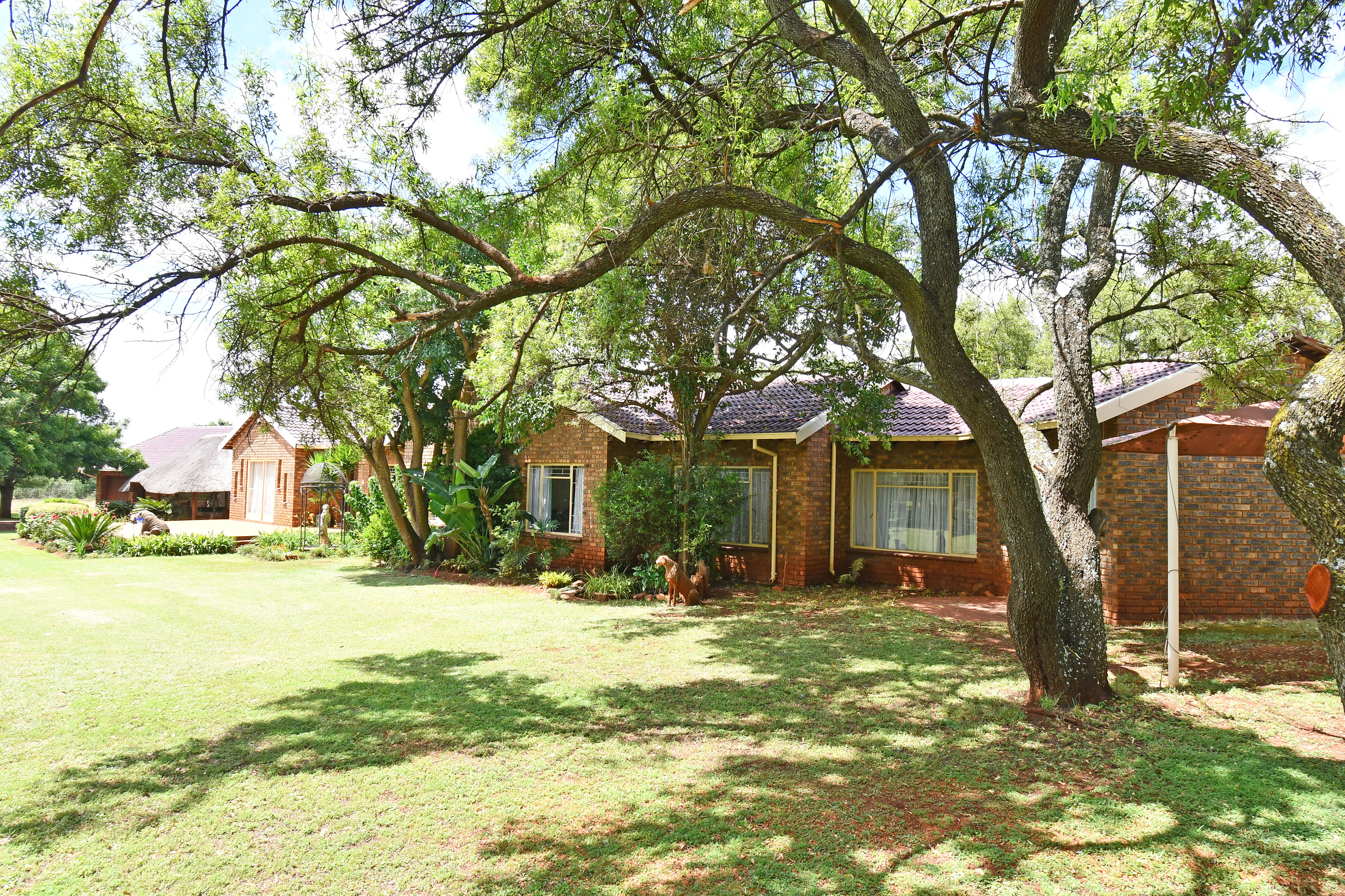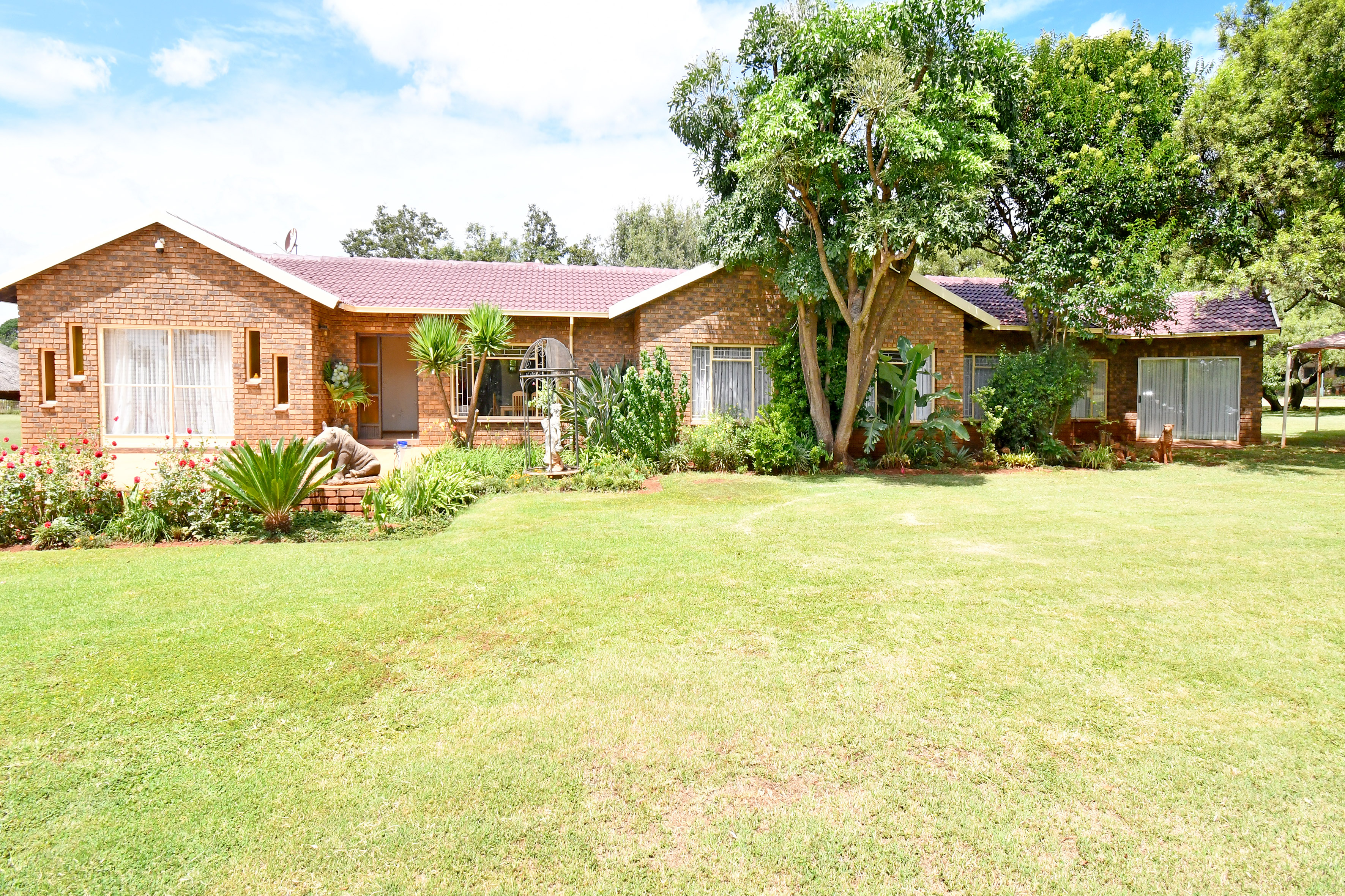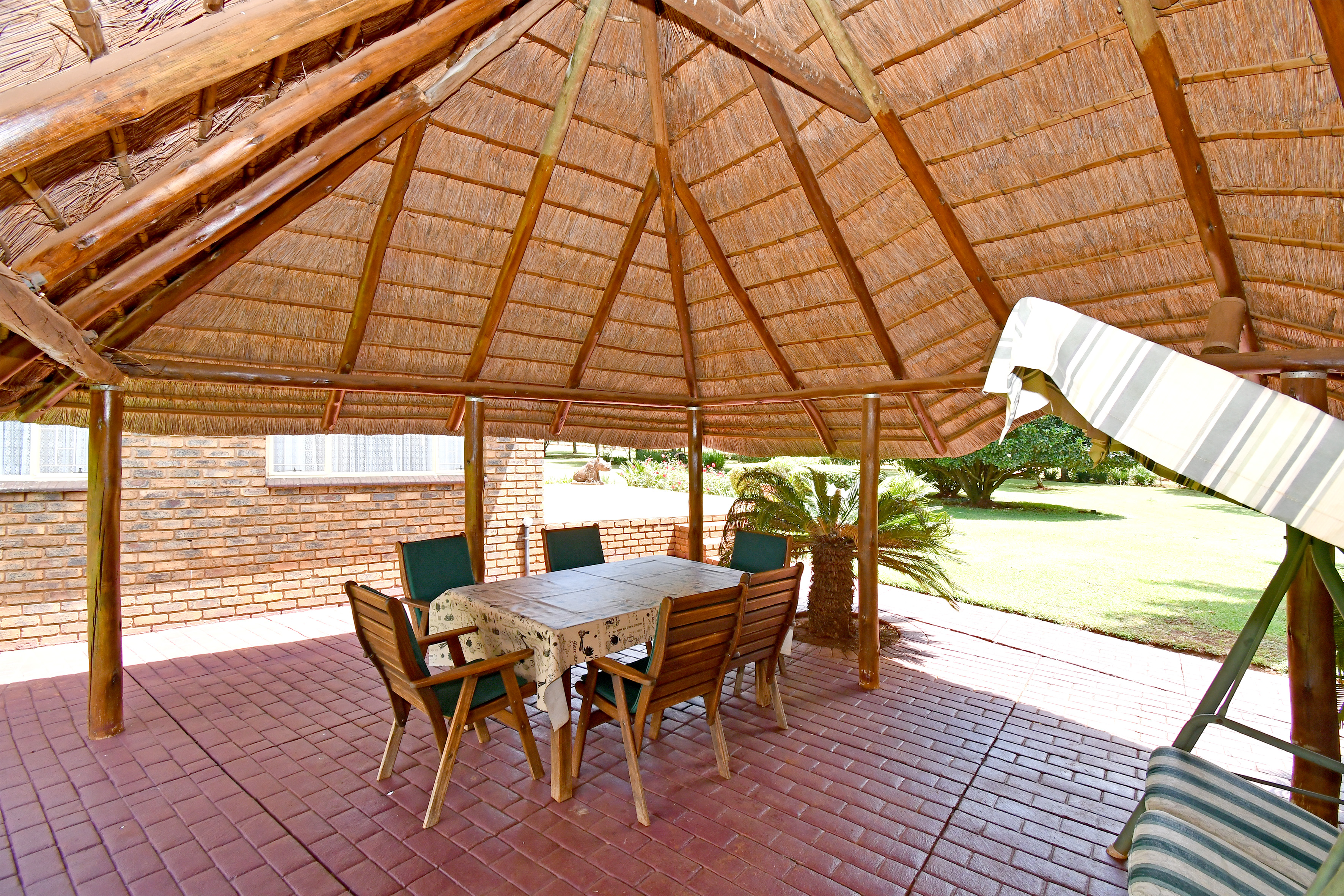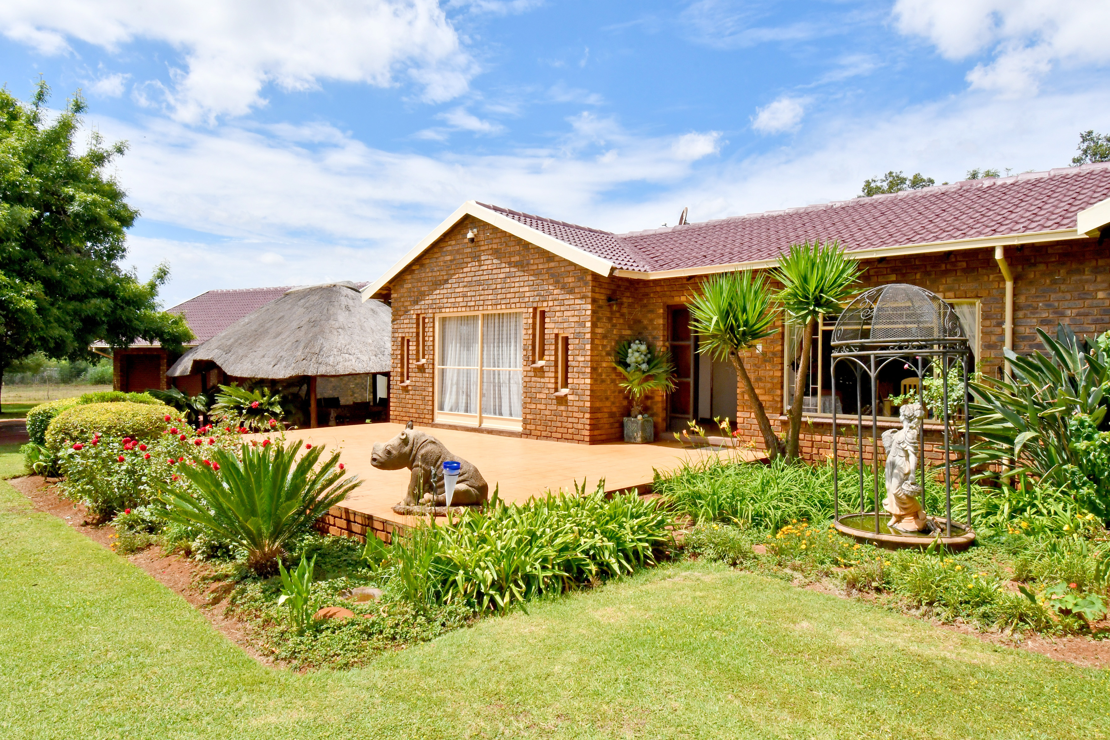 Set amidst an enchanting, established garden with sweeping lawns and mature trees, this home welcomes you with a sense of calm the moment you arrive. A long-paved driveway leads to generous garaging and a picturesque, thatched entertainment lapa — the perfect setting for relaxed family gatherings or tranquil afternoons overlooking the greenery.