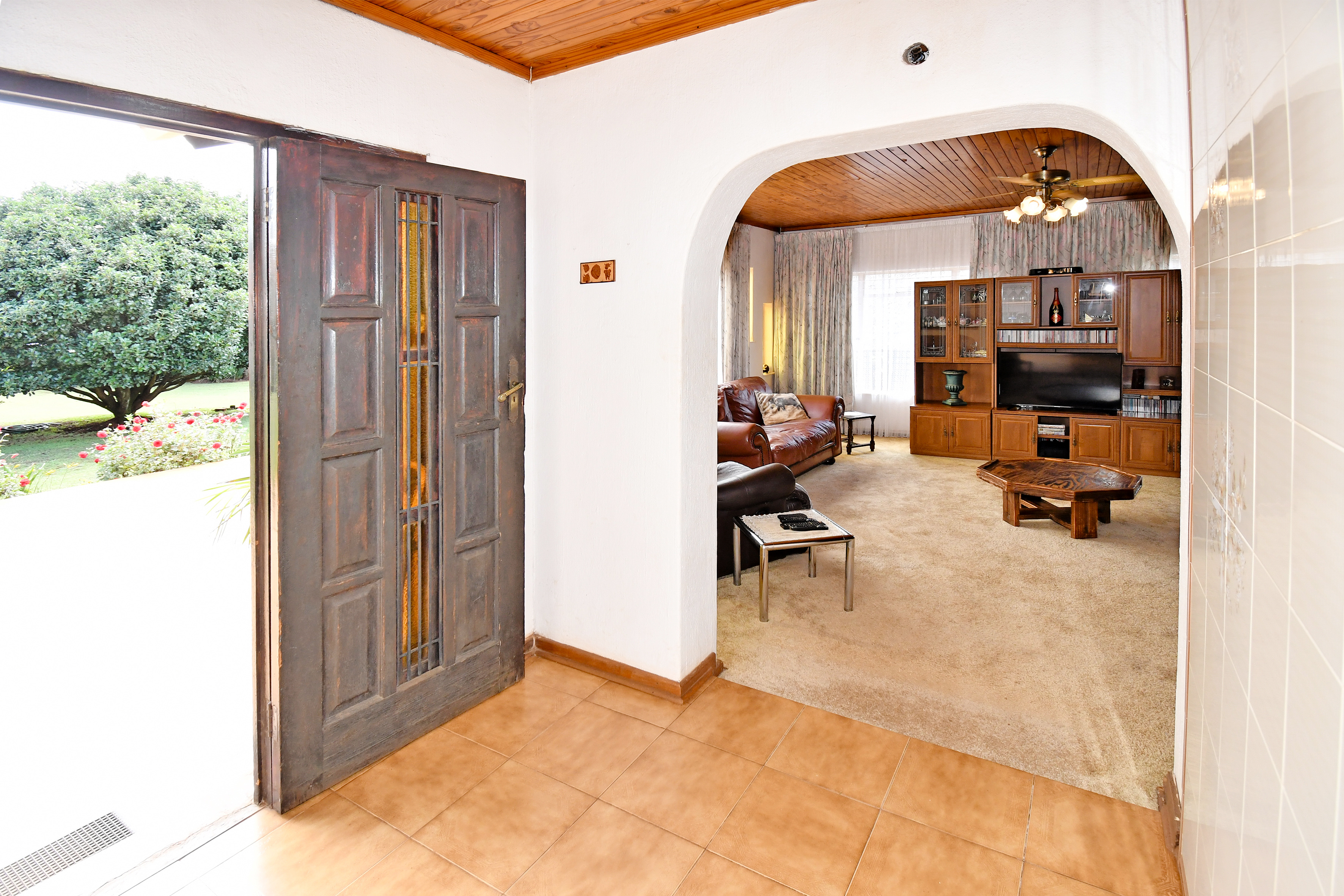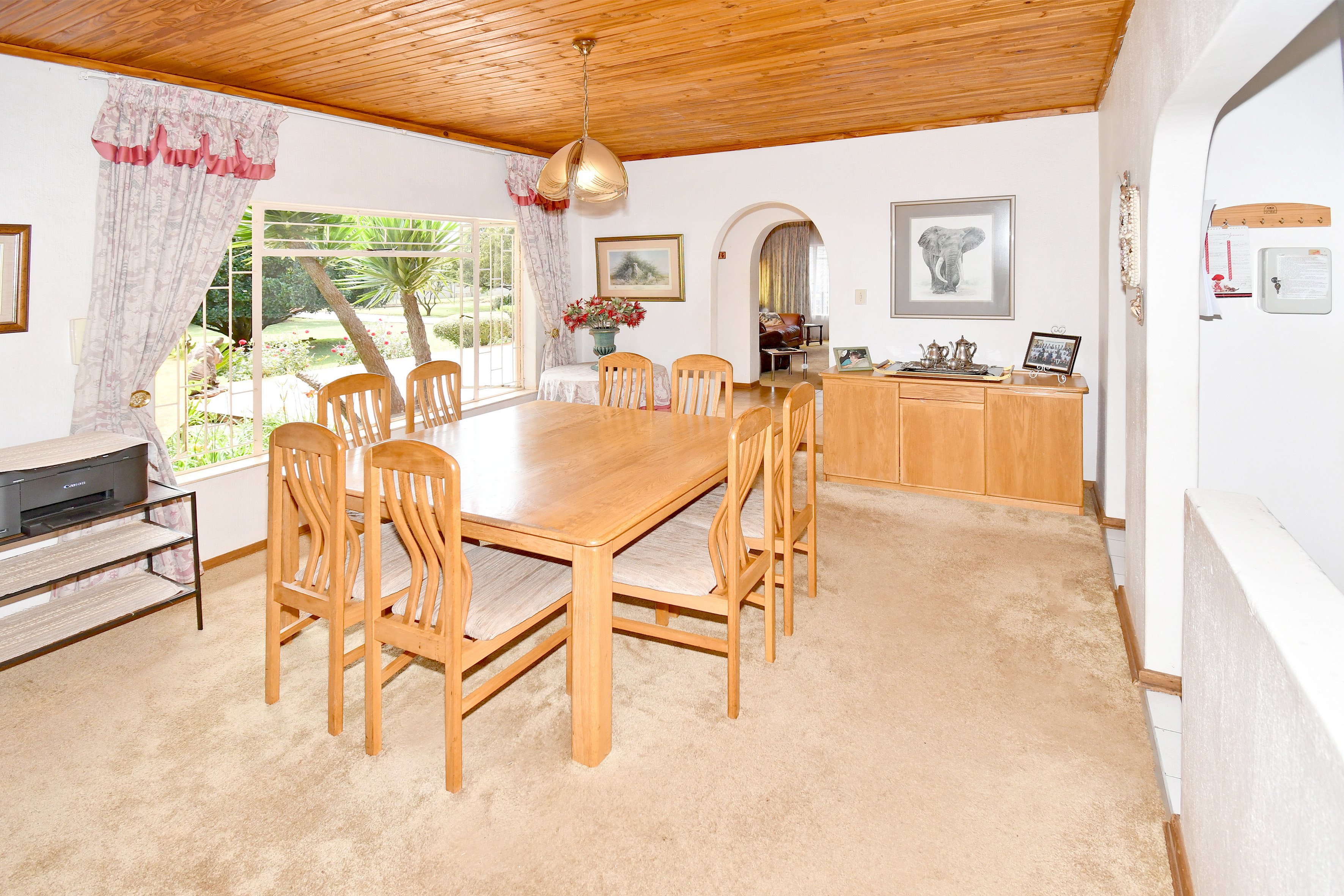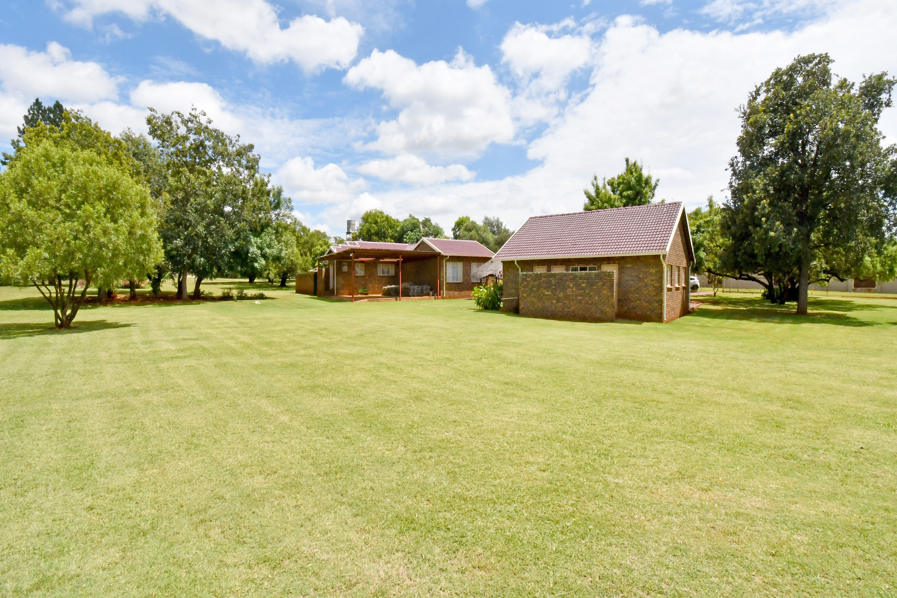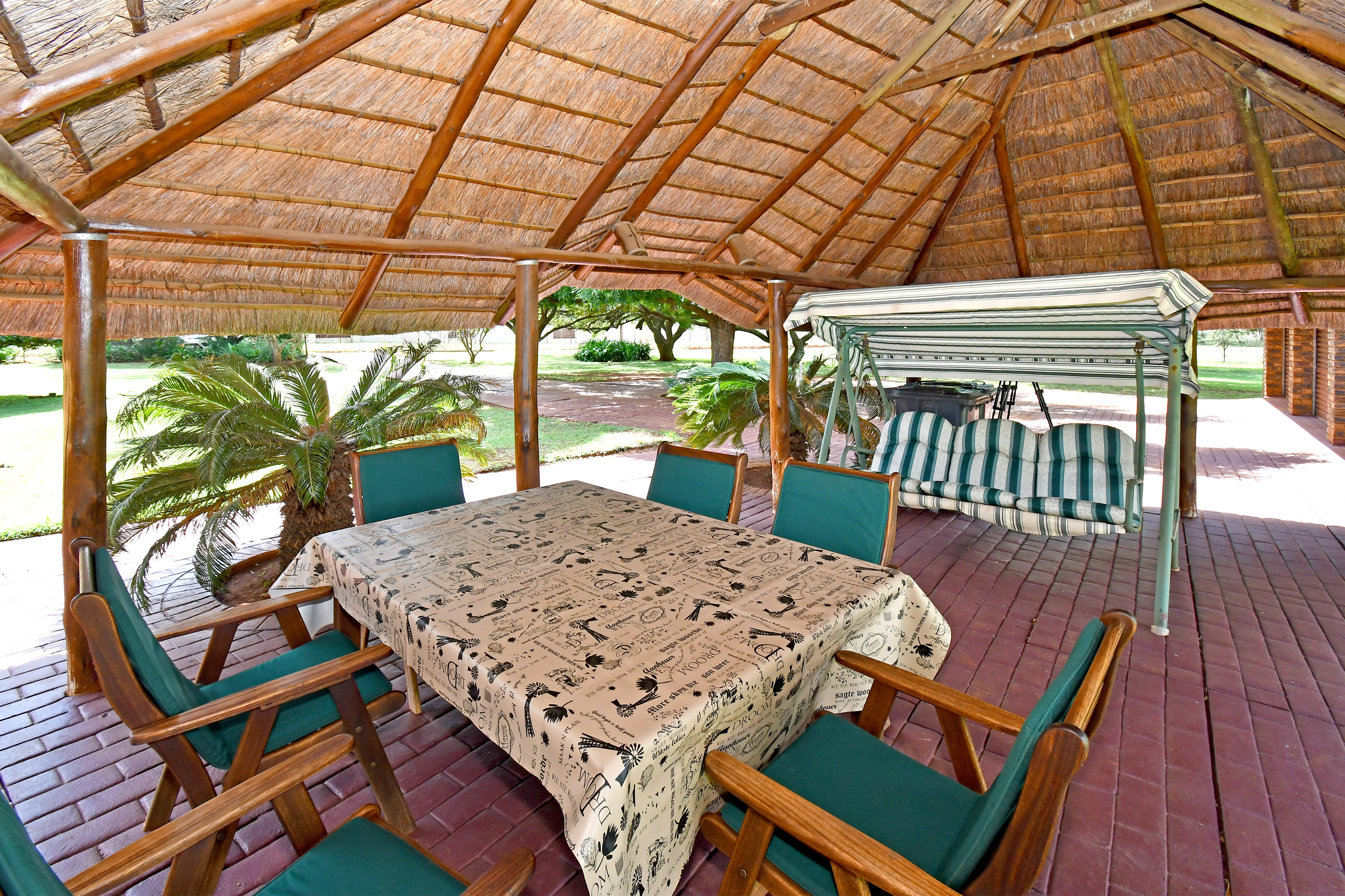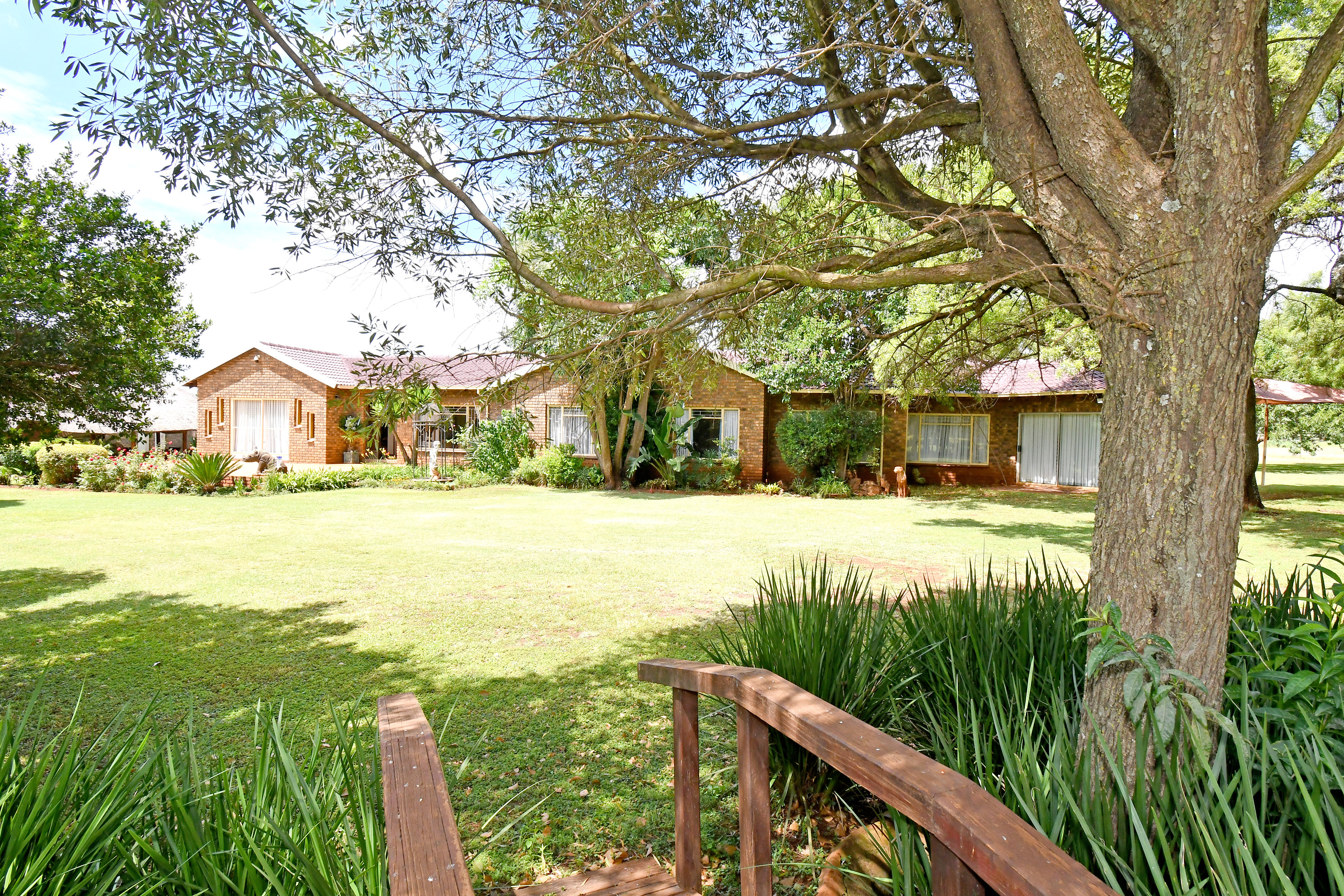 Set amidst an enchanting, established garden with sweeping lawns and mature trees, this home welcomes you with a sense of calm the moment you arrive. A long-paved driveway leads to generous garaging and a picturesque, thatched entertainment lapa — the perfect setting for relaxed family gatherings or tranquil afternoons overlooking the greenery.