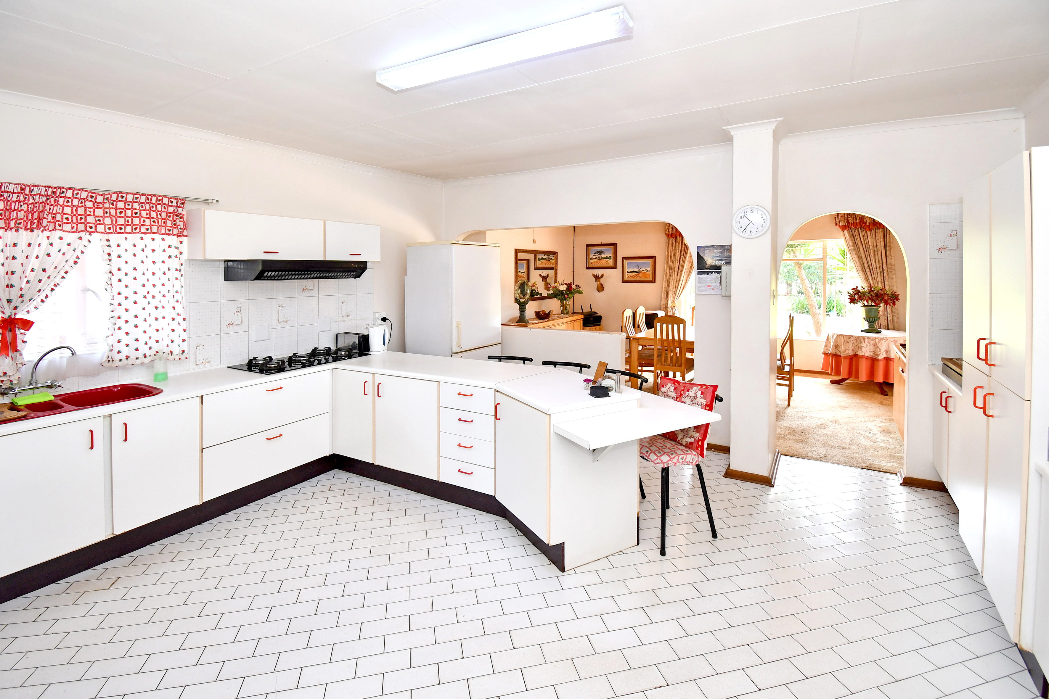 Inside, the home exudes classic country character. A spacious dining area with a beautiful wooden ceiling flows effortlessly into the heart of the home, while arched doorways add charm and architectural interest. The kitchen is well-sized and functional, offering ample cabinetry and workspace — ideal for hearty family meals and effortless entertaining.