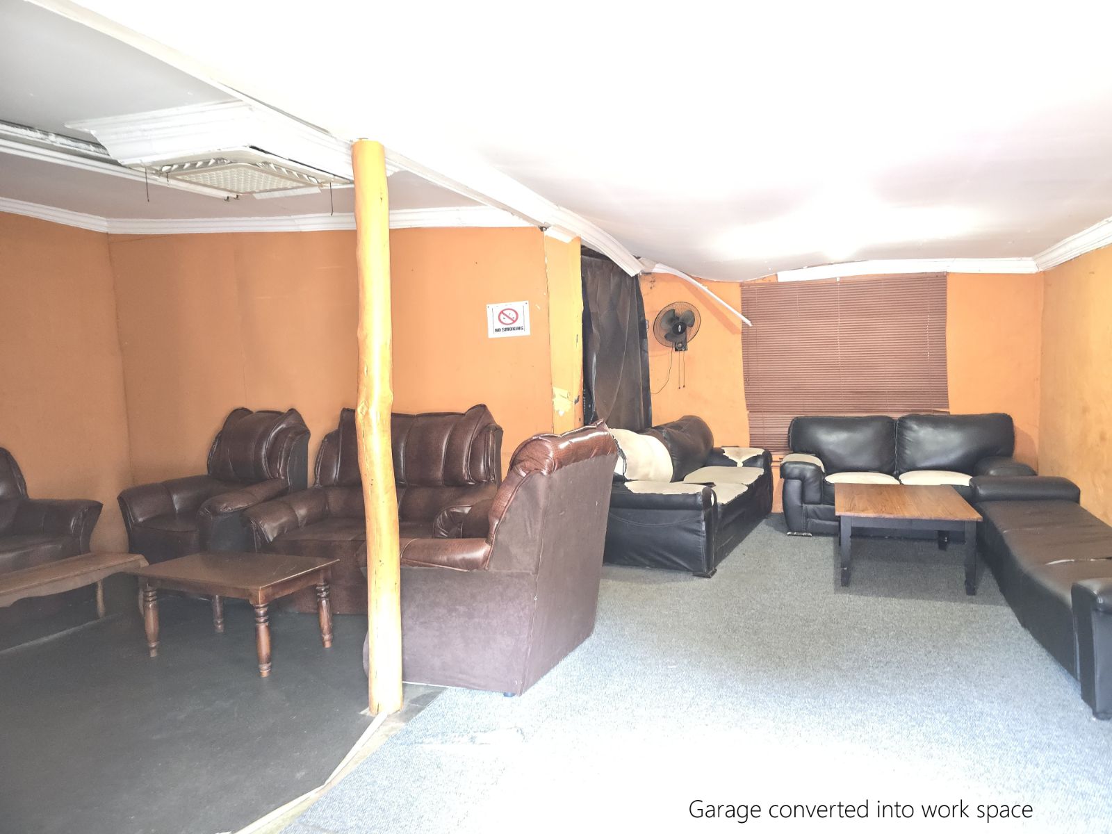 Double garage was converted into a work room / office (with dry wall) and features and air conditioner. The roll up doors are still there so it can be converted back into a double garage