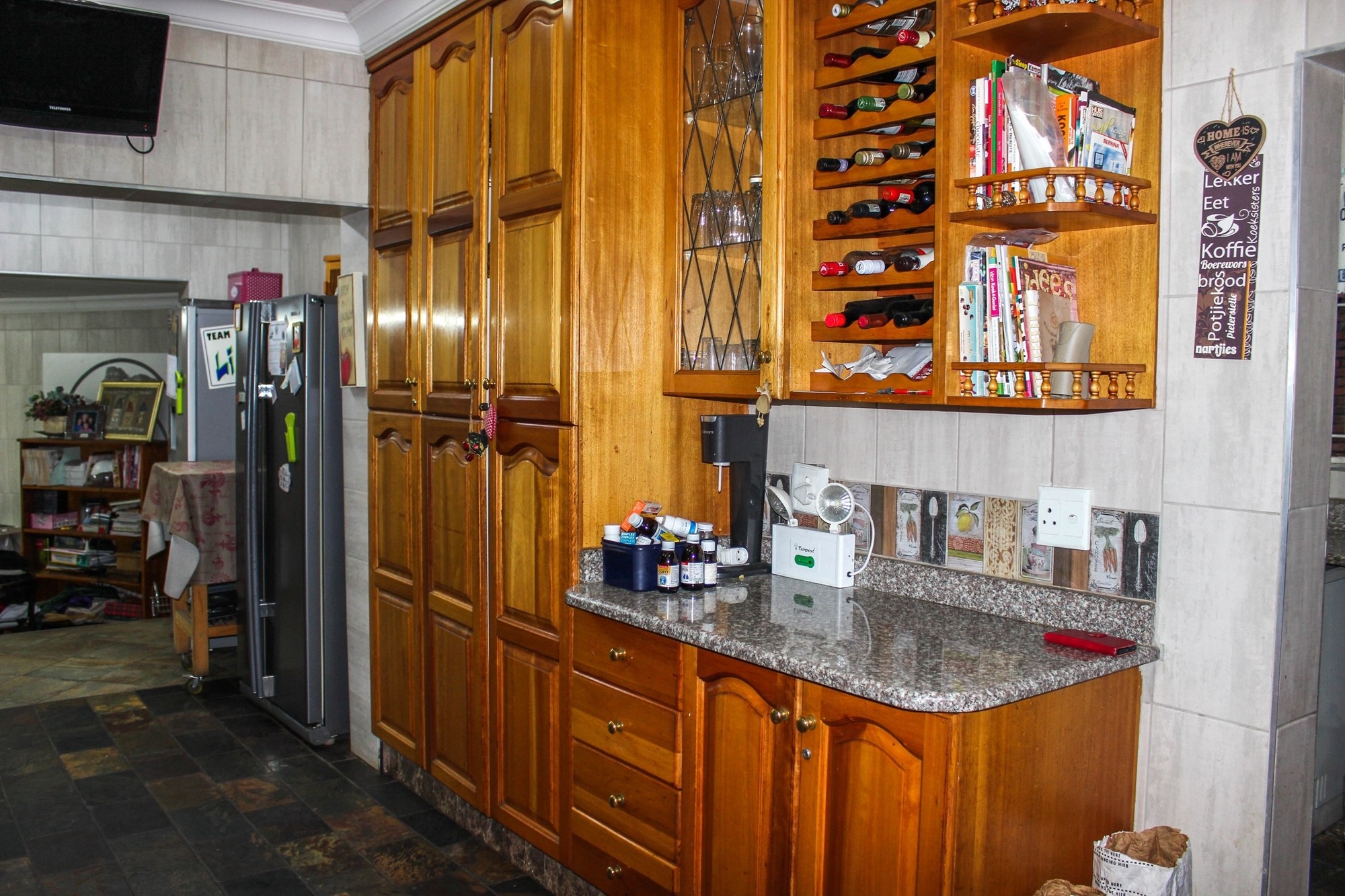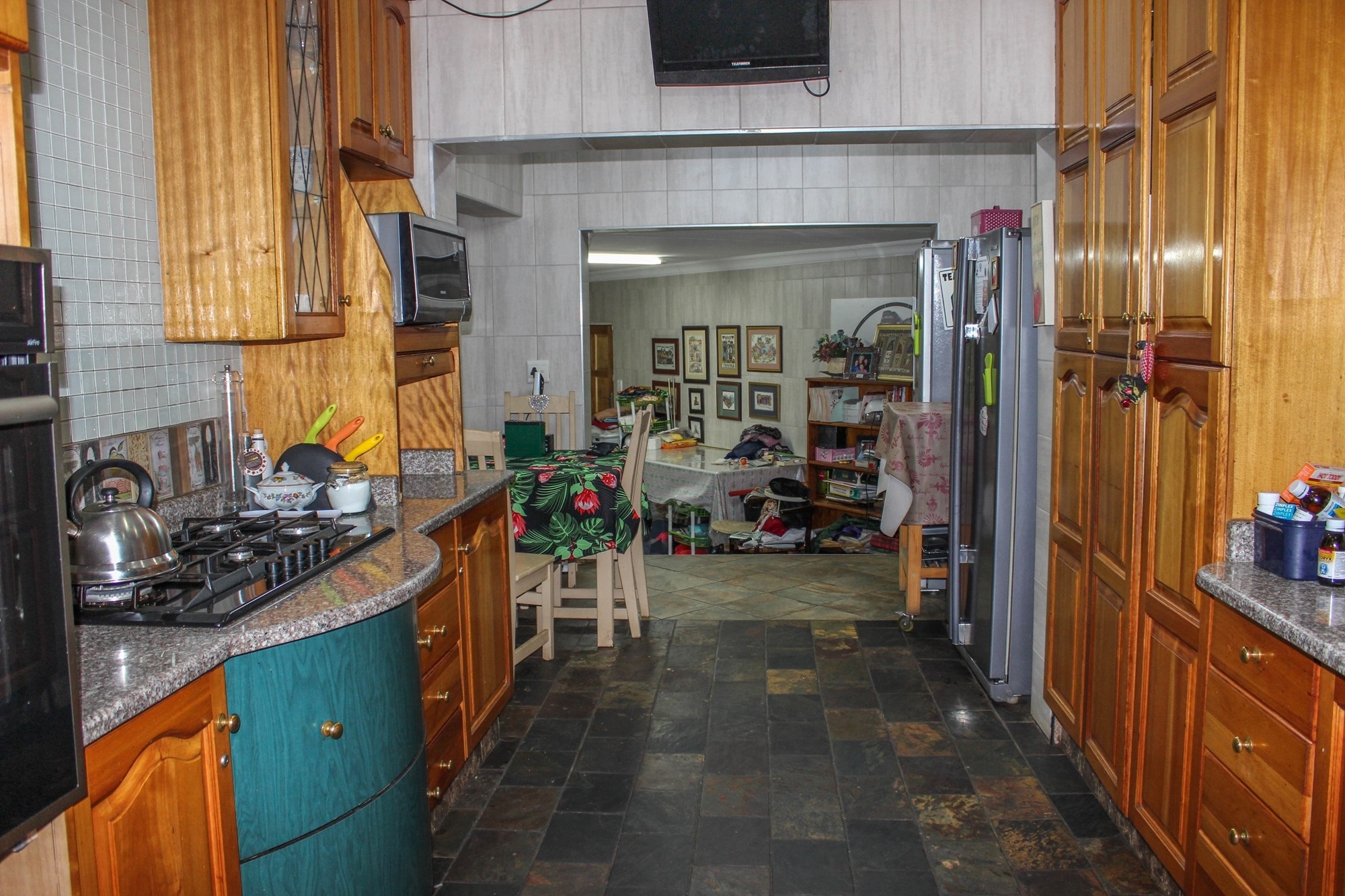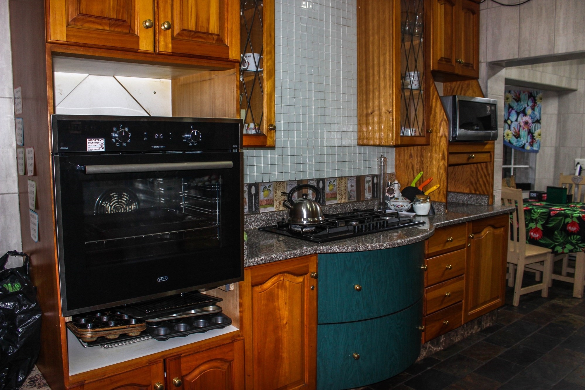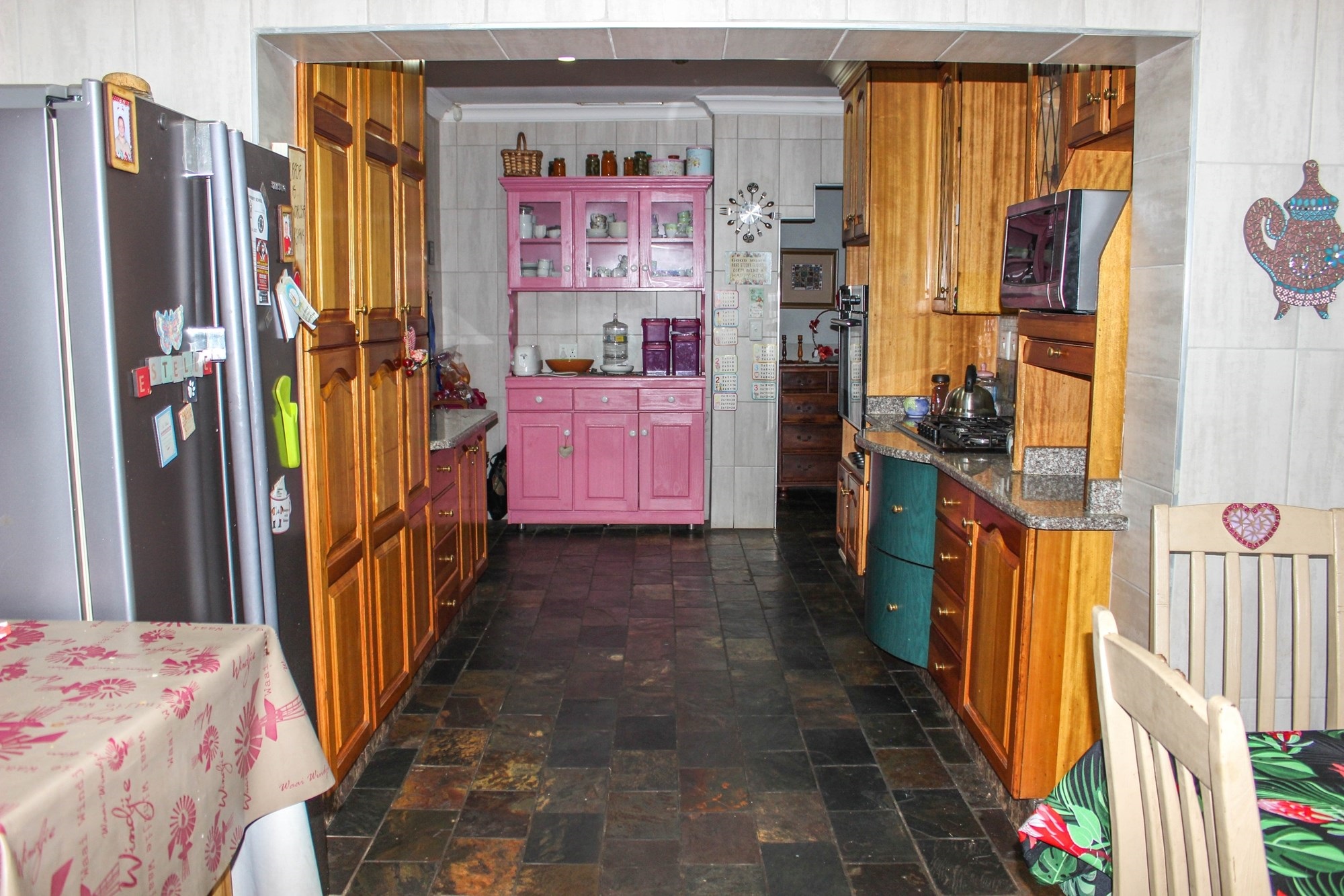 The well-appointed kitchen is a chef’s delight, featuring solid wood cabinetry, elegant marble countertops, a gas hob, and an eye-level oven. A separate scullery, laundry, and additional workspace between these areas ensure convenience and functionality.