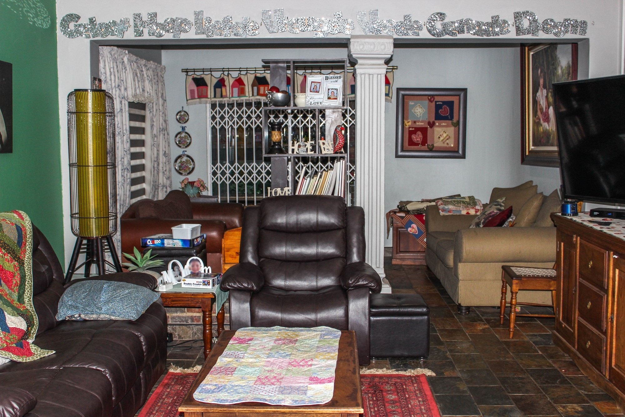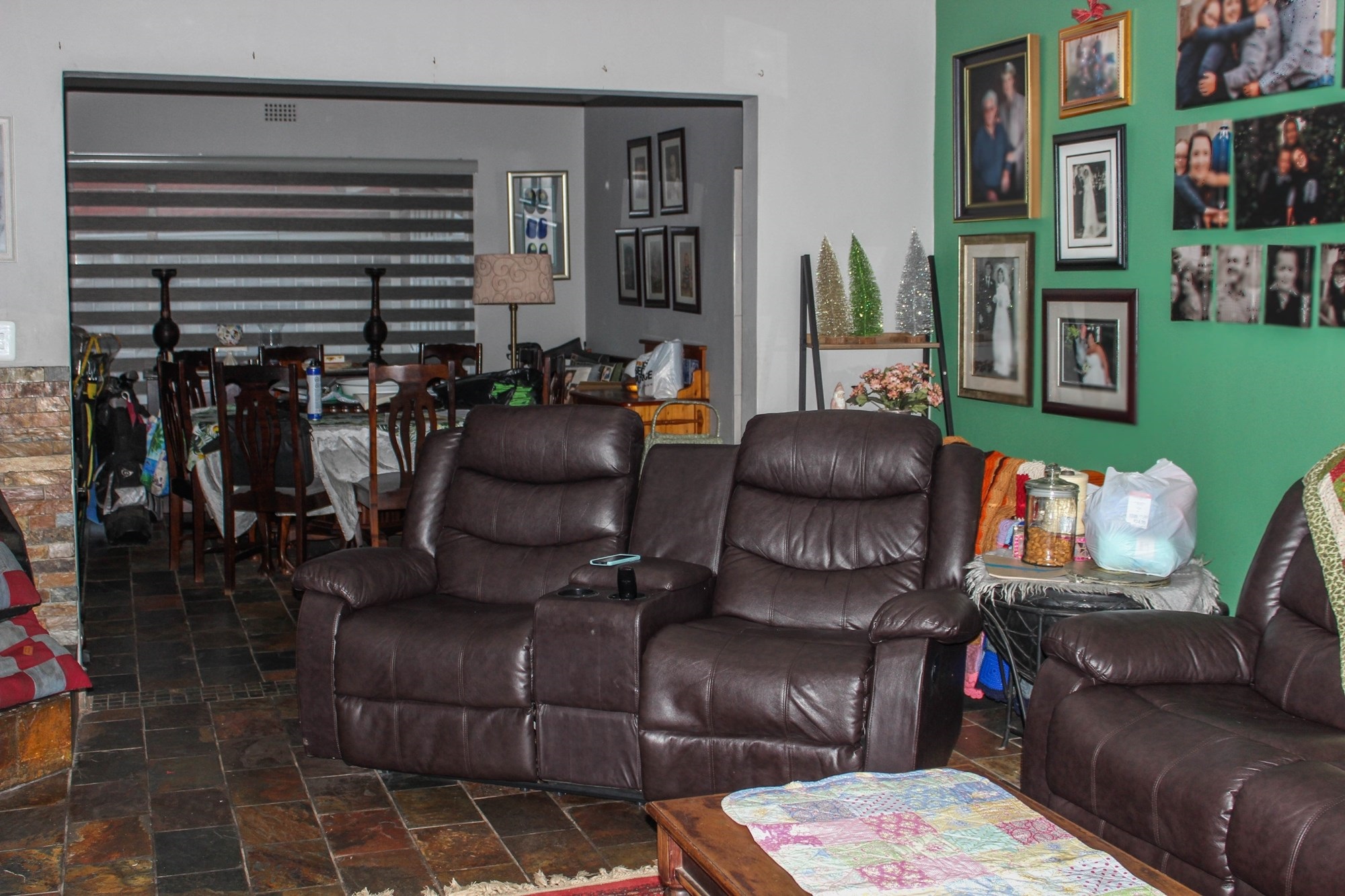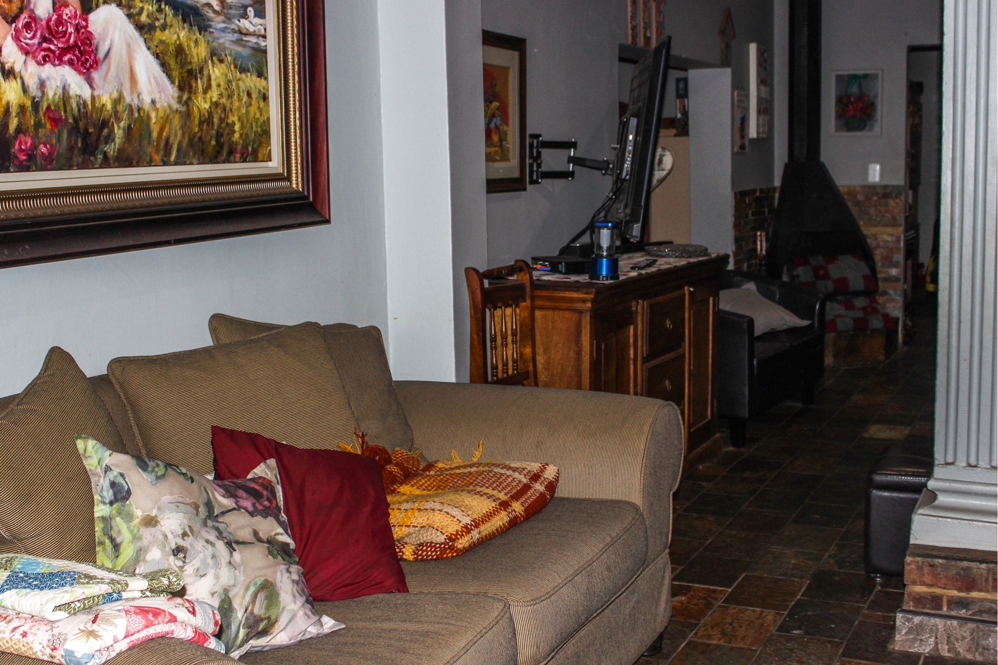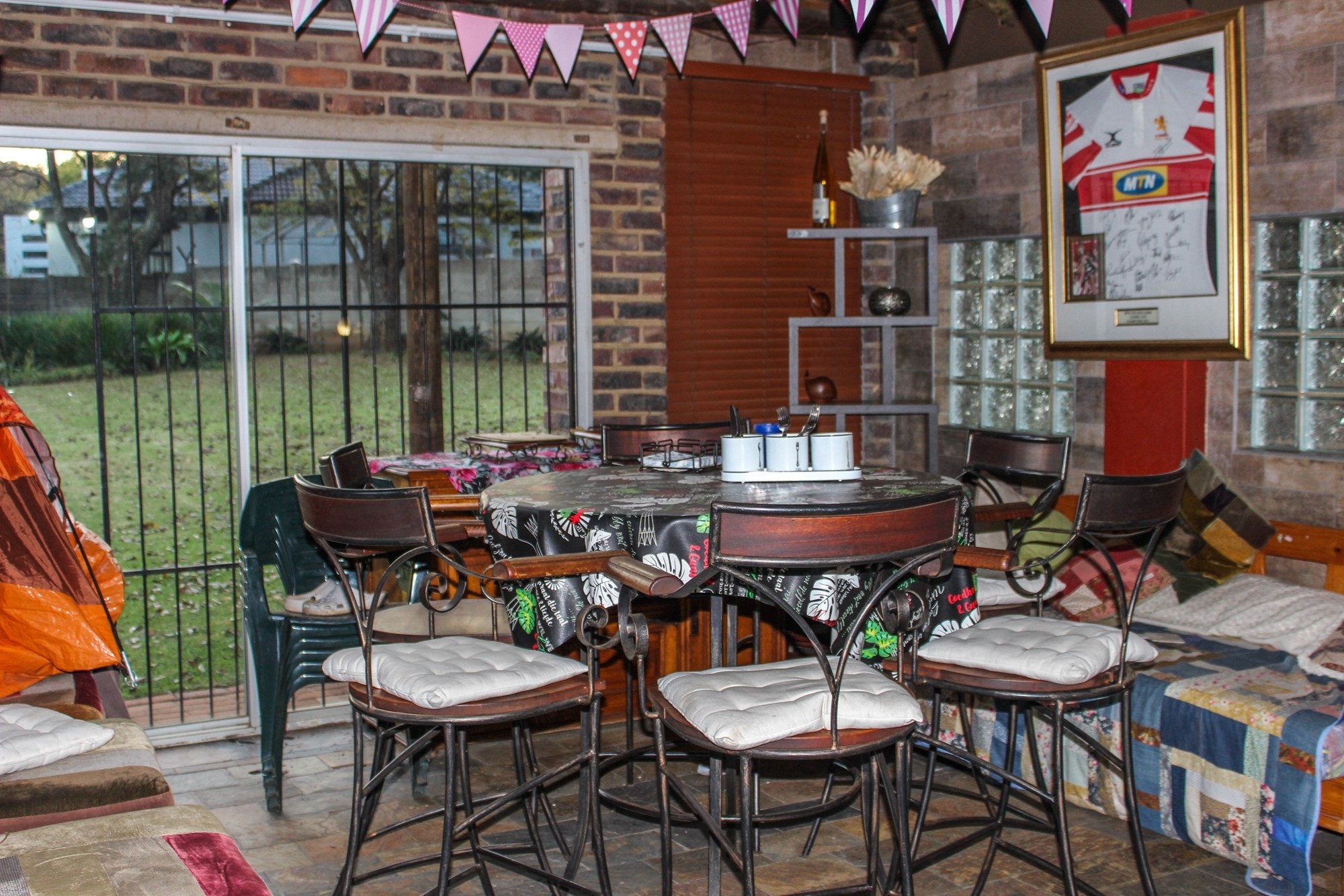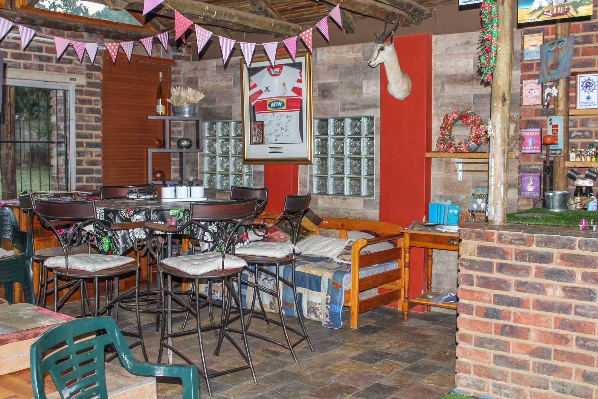 Step through the inviting entrance into a bright and airy dining room, seamlessly flowing into two comfortable lounge areas. The main lounge, with its charming corner fireplace, sets the tone for cosy winter evenings, while the enclosed entertainment room — complete with built-in bar, basin, and braai — is perfect for year-round gatherings. Glass doors lead to the vast garden, offering endless space for children to play, pets to roam, or potential development opportunities.
