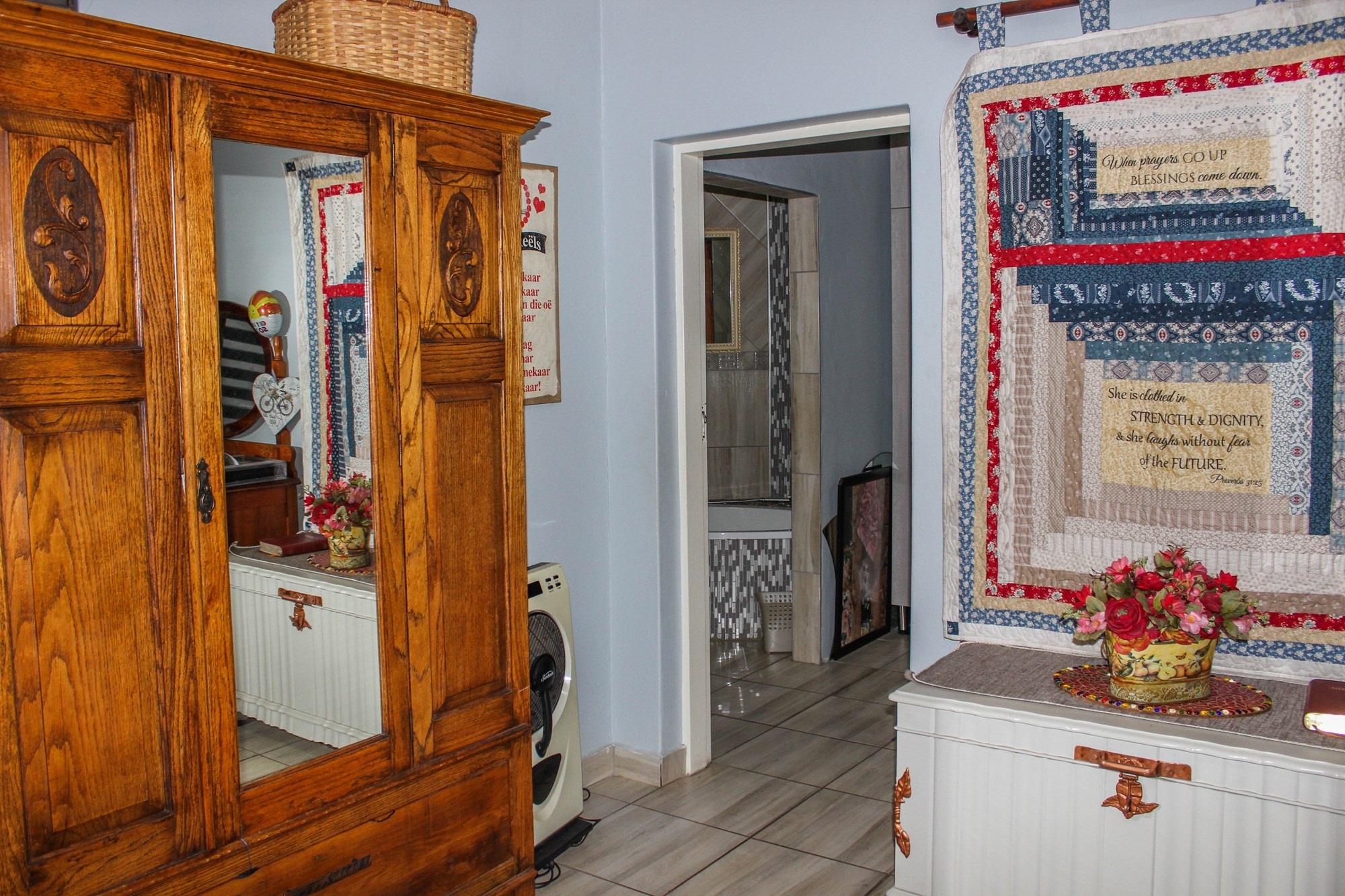 The home’s four bedrooms include a private wing with its own study, extensive cupboard space, and built-in shoe racks. The main bedroom is a true sanctuary, complete with a sun-filled bay window, walk-in closet, and a luxurious en-suite boasting an oval bath and double shower. Three additional bedrooms share a stylish full bathroom.