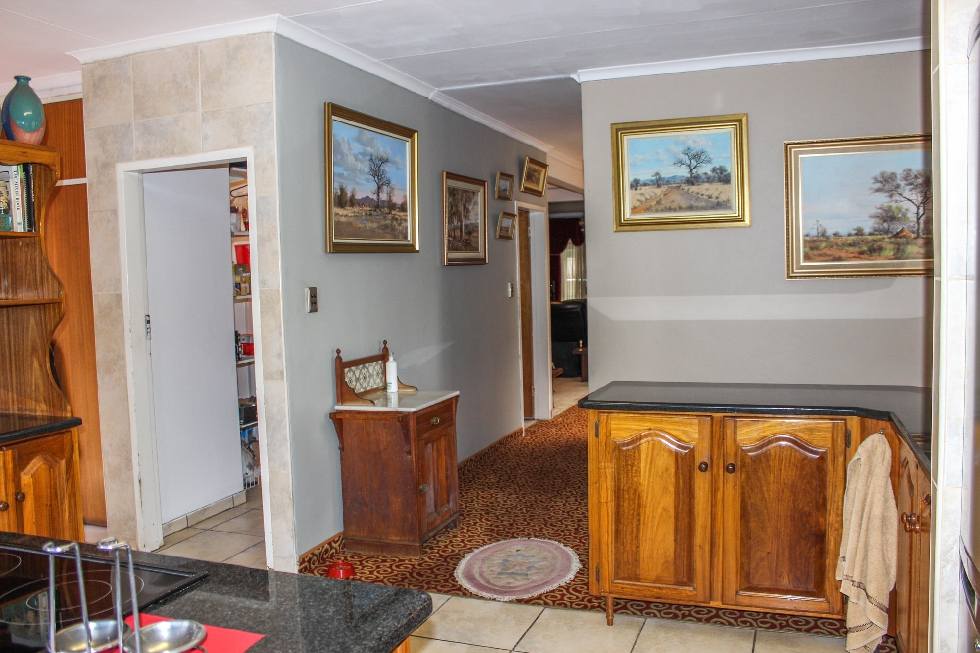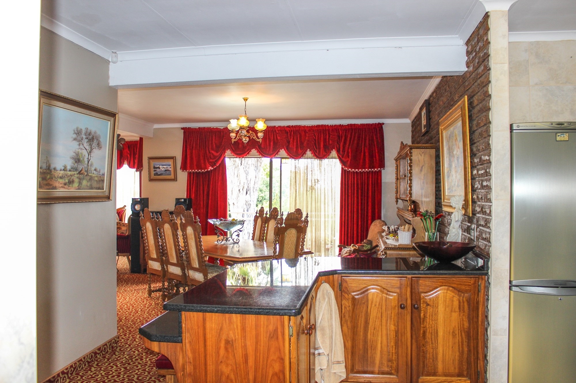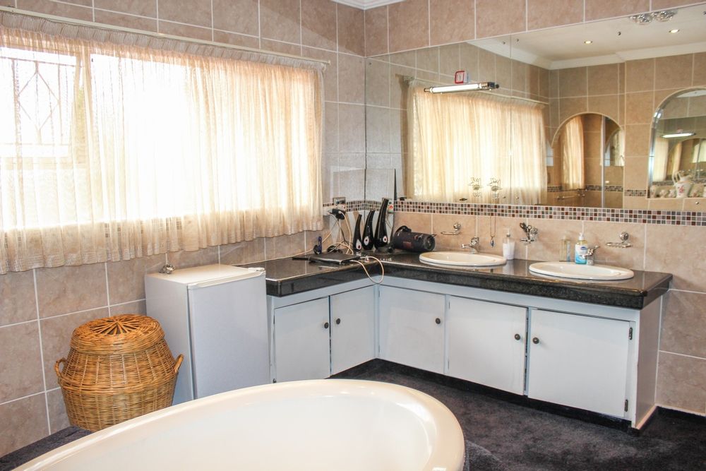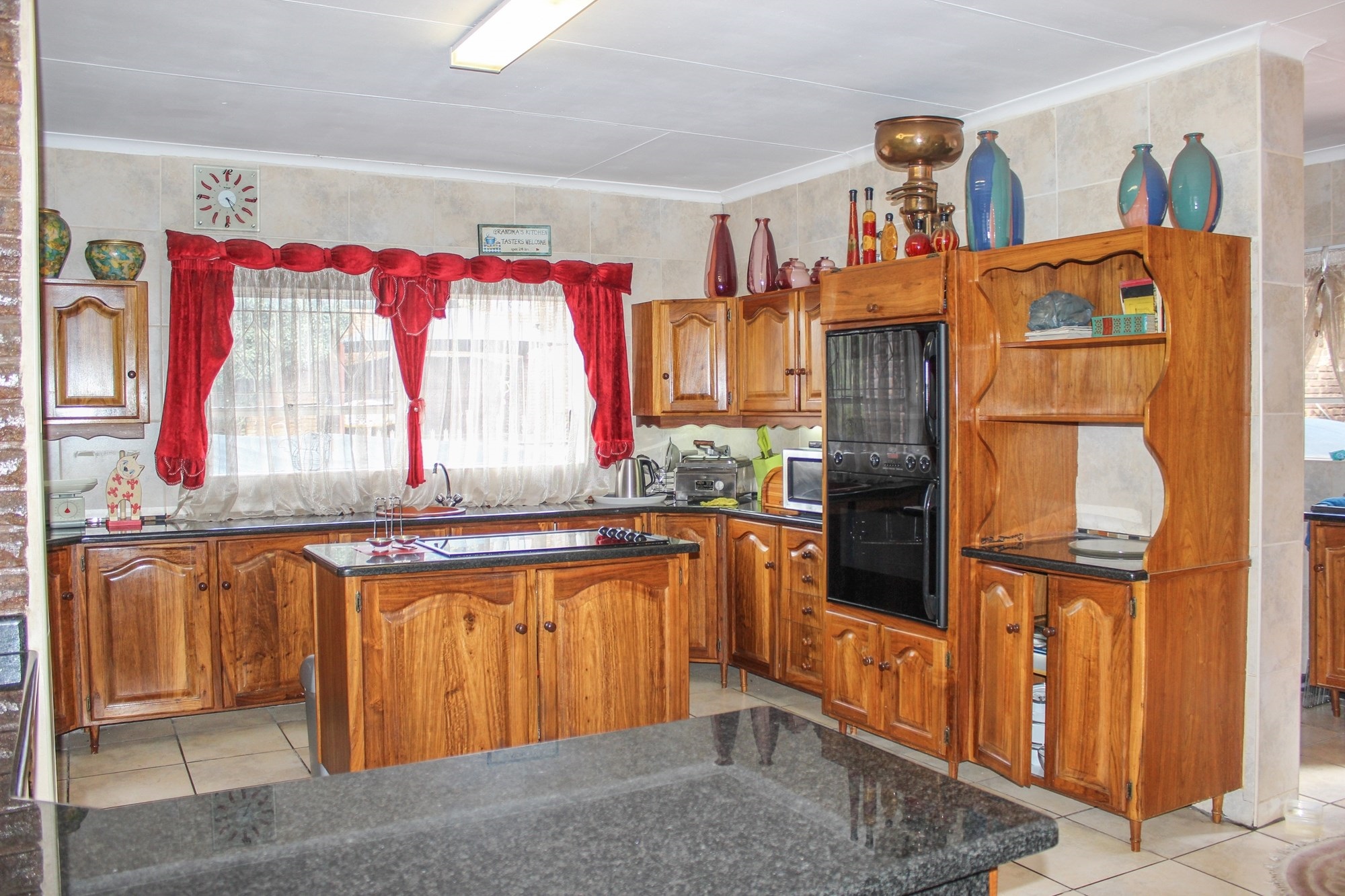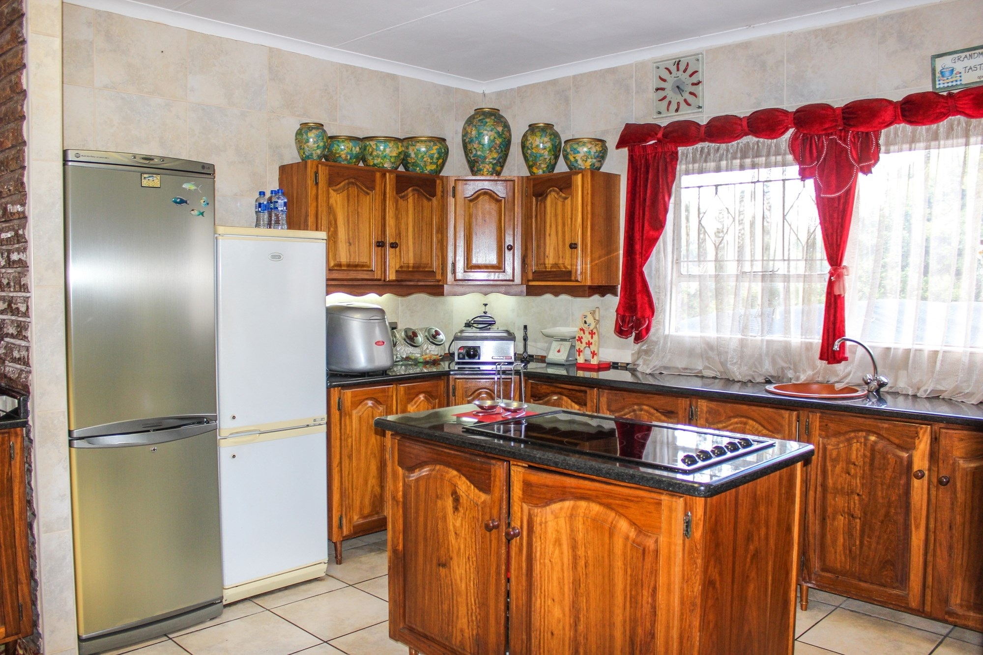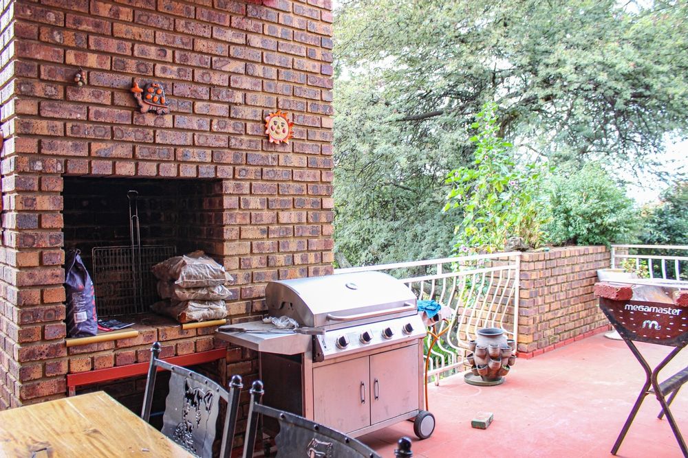 The kitchen is a chef’s dream: solid wood cabinetry, granite counters, a central island, and modern appliances set the scene for memorable meals. A separate scullery/laundry and walk-in pantry add practicality. Step out to your expansive back garden, complete with staff quarters, a wendy house, and elevated views.
