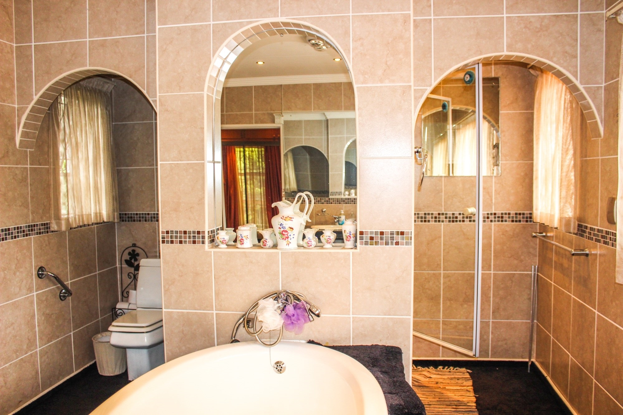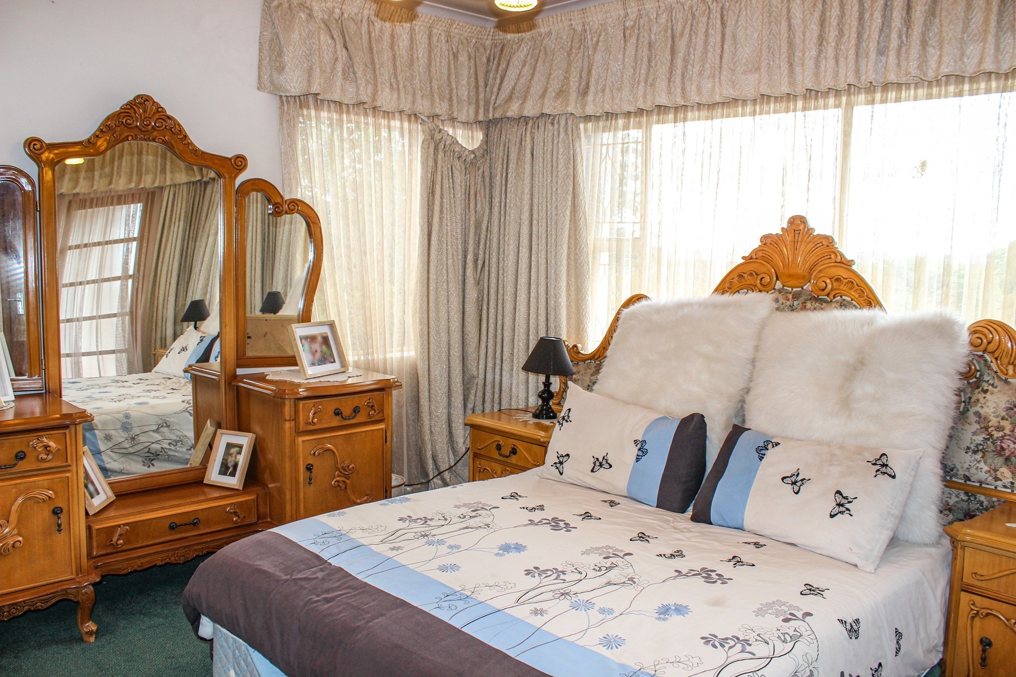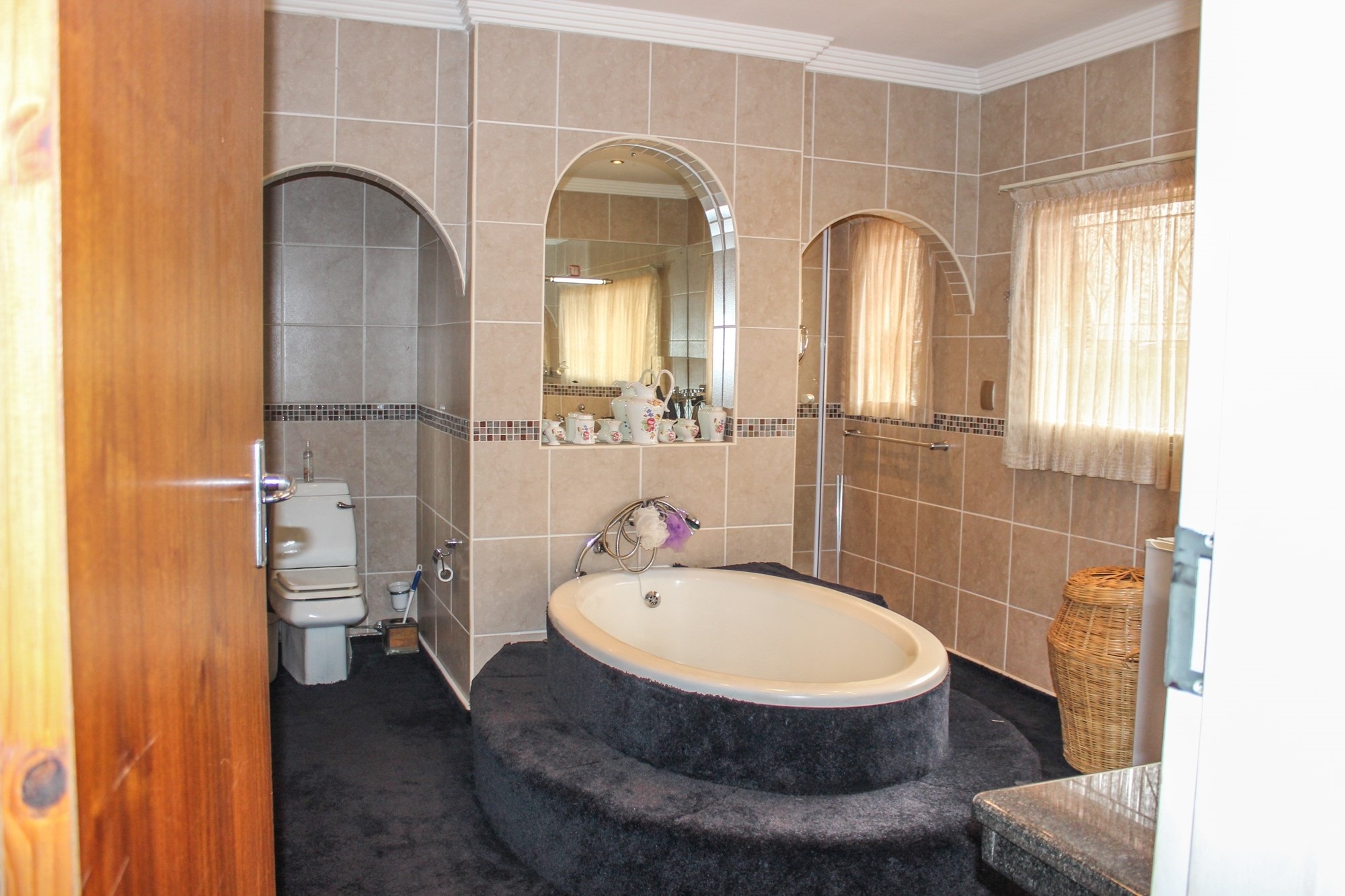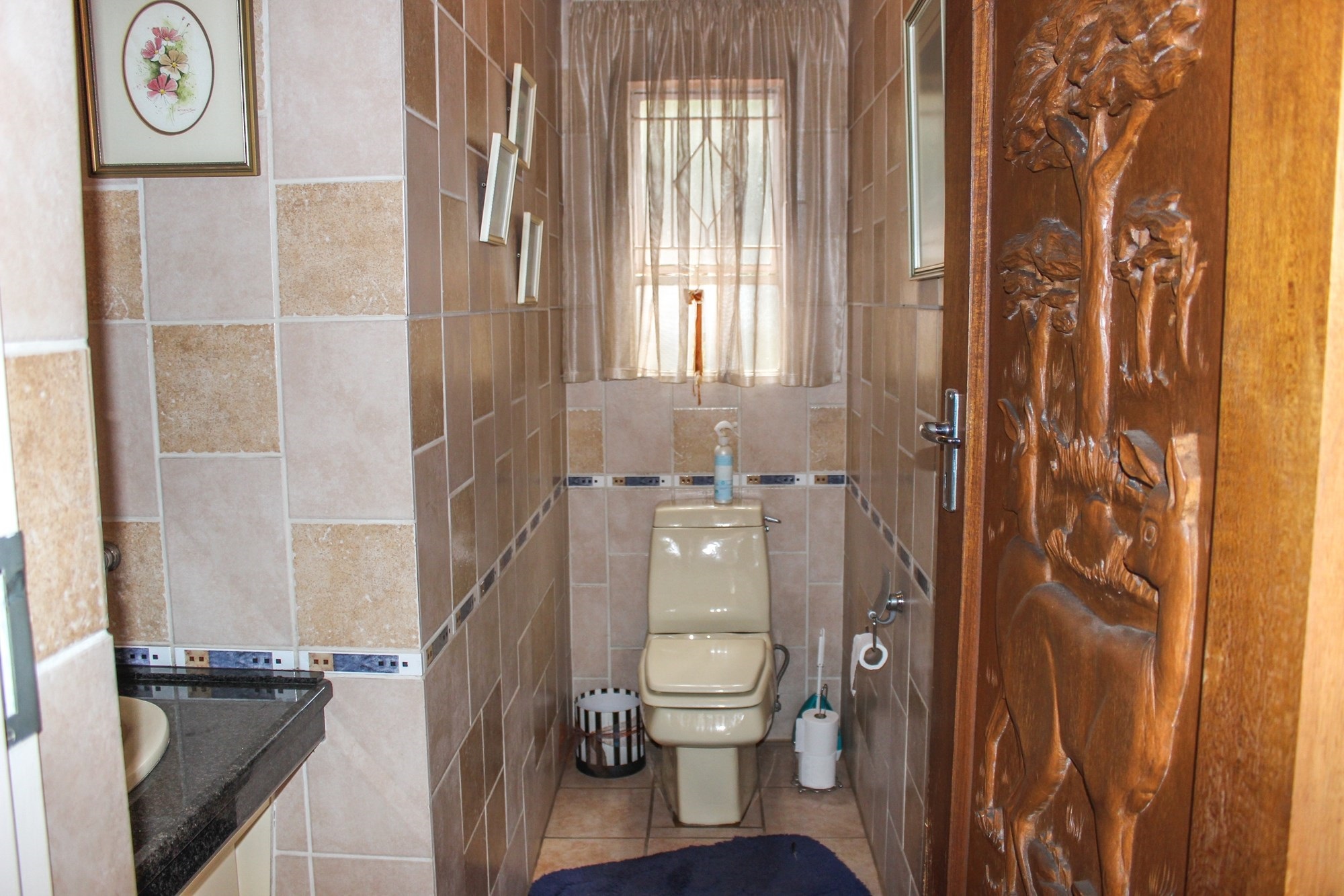 The kitchen is a chef’s dream: solid wood cabinetry, granite counters, a central island, and modern appliances set the scene for memorable meals. A separate scullery/laundry and walk-in pantry add practicality. Step out to your expansive back garden, complete with staff quarters, a wendy house, and elevated views.